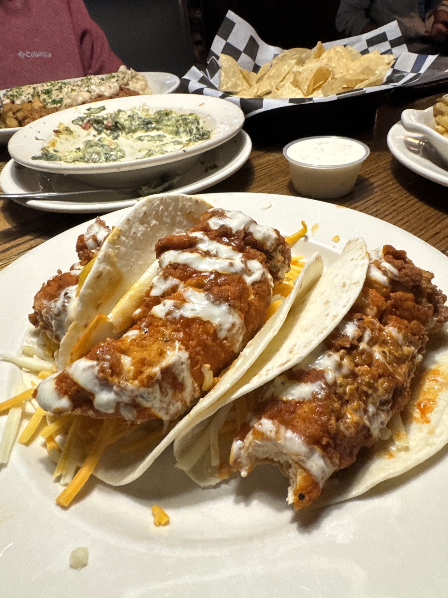 Read moreTypical sports bar as far as atmosphere, so it was pretty loud (Friday evening). The food was EXCELLENT. We both had a chicken dish- I had Buffalo Chicken Tacos and hubby had Chicken Fried Chicken. We both said it was the best chicken (tender, not over breaded, well seasoned) we’ve had in a while. We also had the Spinach Artichoke dip for an app. The chicken Tacos were large enough that I ate one and took 2 (plus my cheese fries) home. That made for 2...