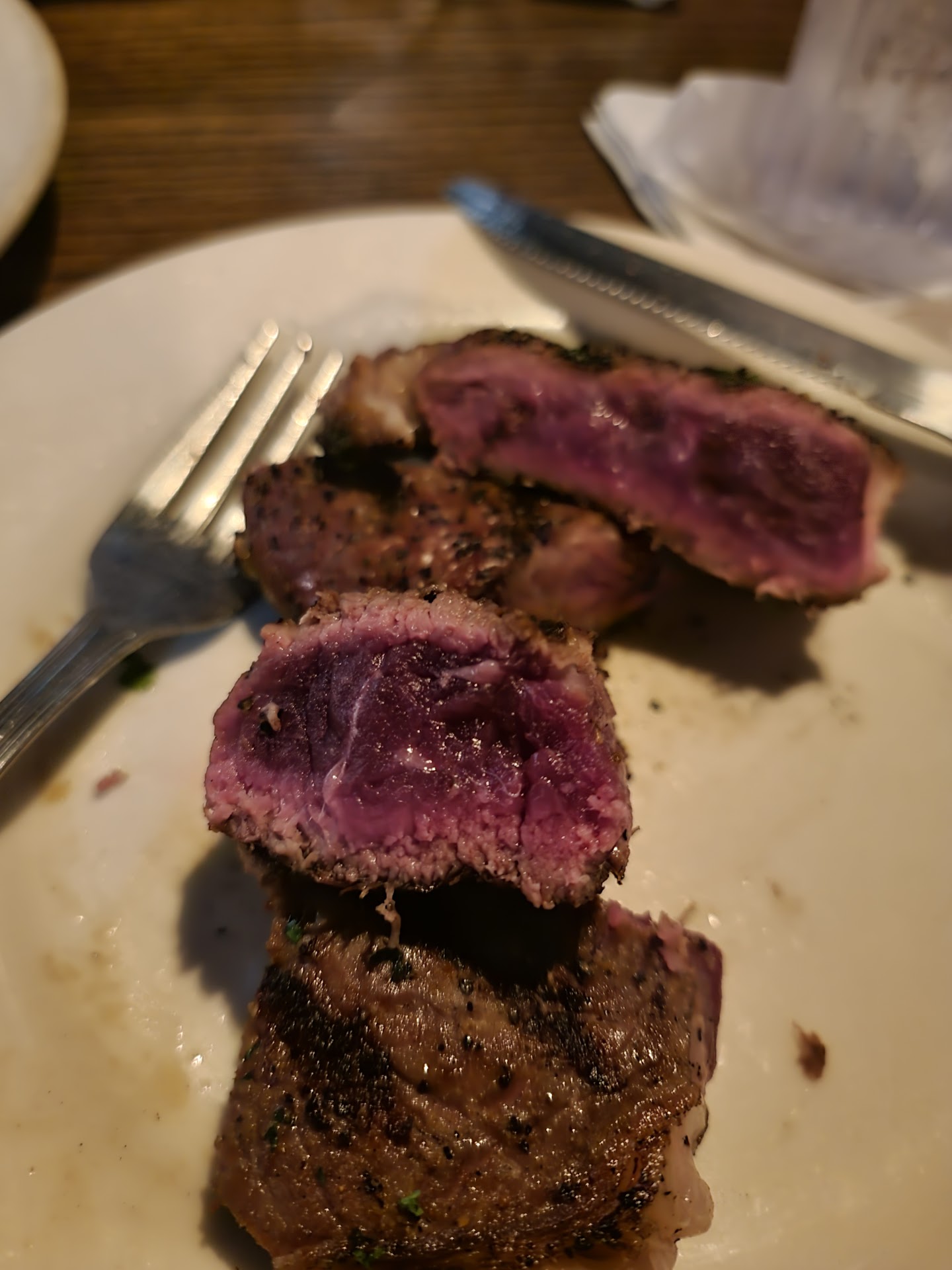 Pictures are of a "medium rare" steak after it was sent back to be cooked a second time. When it first came out, it was bluer than this. The kitchen claimed it was "their version of medium rare." I'm afraid of what you would get if you ordered...