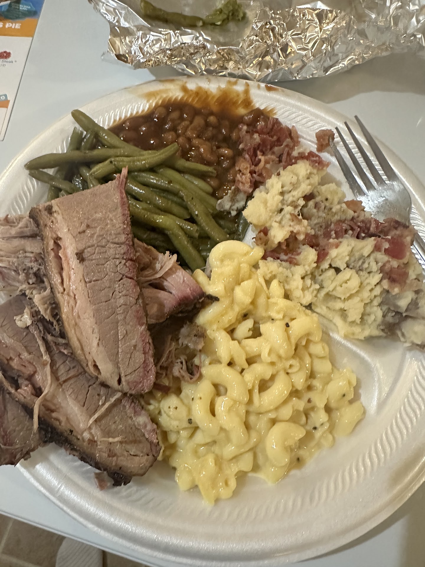 The beans were good, but a little too sweet with sort of a strange underlying flavor. One kid thought they tasted a little ash-like. I thought it might be onion powder, but hard to tell. The rest of the sides were outstanding! Love the slaw. Very wet, perfectly sweet with a hint of celery seed. Mmmm Mmm. Potato salad was sort of a creamy baked potato salad. The onion rings were perfectly crisp and not too oily.. and a lot of them. And the okra tasted very fresh, and very abundant. Altogether, it was just shy of just enough for six grown folks.