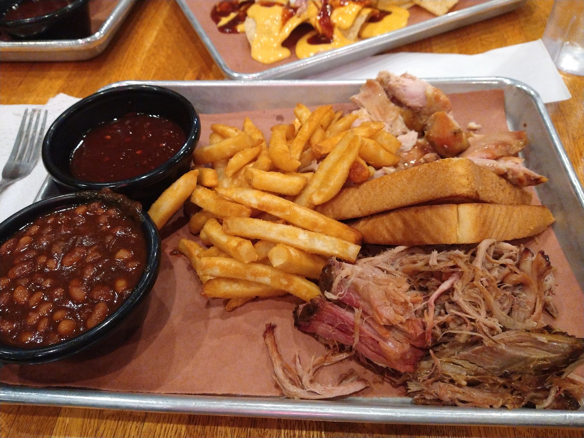 We started with nachos. They were pretty decent sized. But a little light on pork and a little too heavy on BBQ sauce, which was just too sweet. Also, no jalapeños.