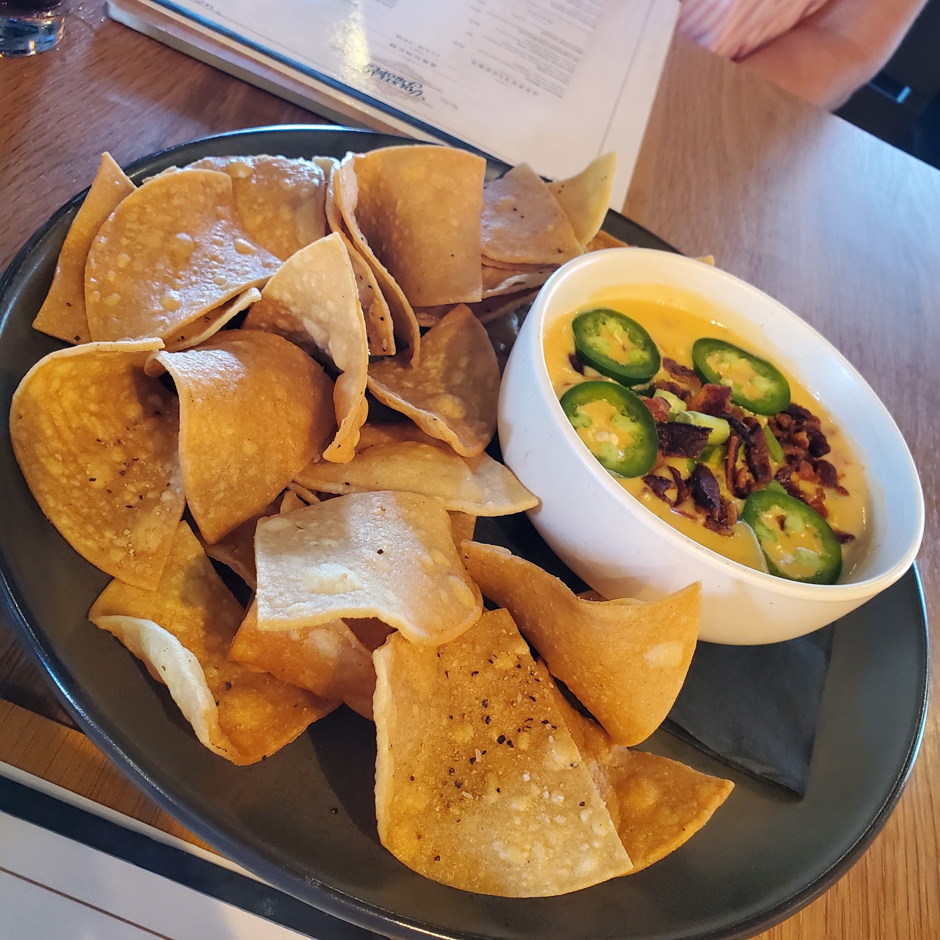 Next up the food. We got cheese dip. It is 100% Rotel dip from a potluck with bacon added. Now that's not to say it tasted bad, but it's definitely not some new exciting cheese dip you've never had. I did like the thick chips they serve with it but this wasn't impressive.