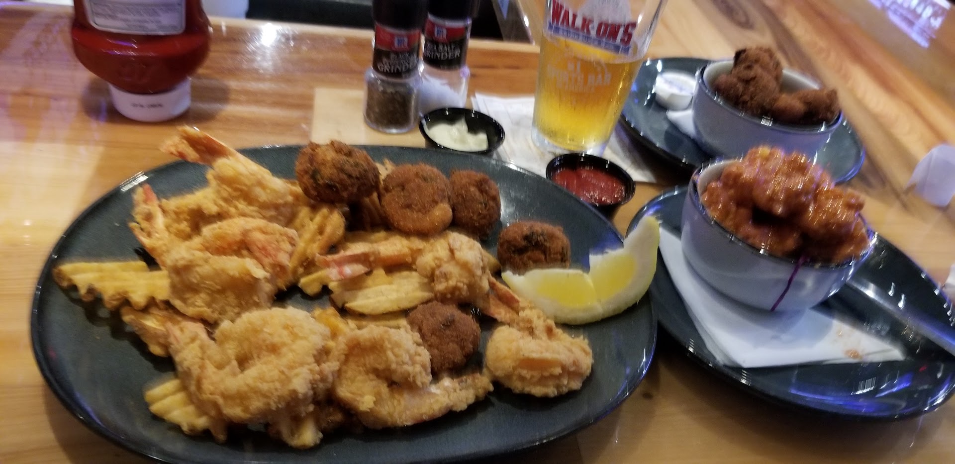 Ā Ā Ā Read moreEdited.... See edit below. Good atmosphere, plenty of TVs, good beer selection. We ordered two apps for the table. The first, the boudin balls arrived just barely over warm, and the perfectly uniform appearance if outer batter screams food service supplied or definitely not prepared in house. The second was boom boom shrimp. Again, not served hot, and not particularly flavorful. We then ordered entrees. One guest ordered a burger which she said tasted good, but was served with exactly four waffle fries. One would expect a bigger portion for the price of the burger. The second ordered a bowl crawfish etoufee. The top was āskimmed overā as he described it indicating that it had been sitting for a while and not again, it was not hot. I ordered the Redfish Rudy. Again, NOT SERVED HOT! The serving dish was hotter than the fish that was plated in it. I ate a few bites and concentrated on the beer and the basketball game. This is not a Cajun restaurant. This is a sports bar that serves Cajun style food, so if you go with those expectations, you will not be disappointed. I do plan on going back, because it has a good atmosphere; again plenty of televisions, and the waitress on staff, āDeeā was prompt and friendly; perhaps the best element of our visit given that the home team lost that day. By the way, I want to meet the reviewer who said this was āthe best food he ever ate.ā My guess is that his culinary experiences have mostly come from the freezer section of the local grocer. Edit: STAR ADDED I have returned to Walk-ons on at least three occasions since the review, and the quality of the food has improved immensely. The food has been served hot, and the catfish po-boy that I ate was as good as you're going to find around here. I believe the first review was based on an experience at a restaurant that was still fairly new and getting its legs under it. Give it a try and see...