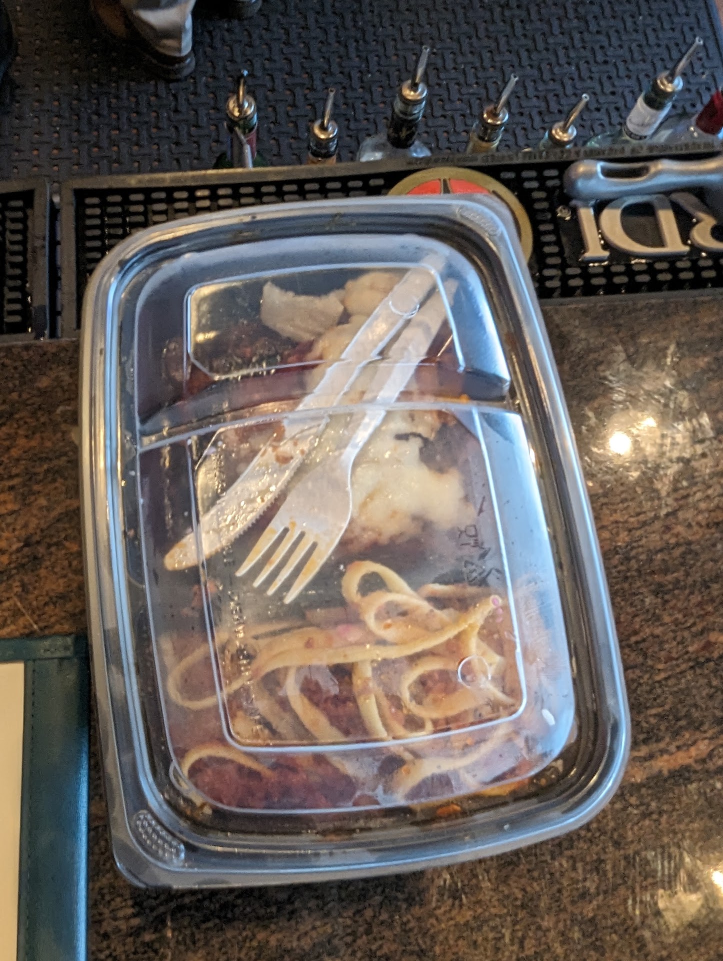 I get my white bag, trudge back to whence I came, and start to divide up the food. It was strikingly similar to kid cuisine, the black plates sheltering the quite obviously nuked pasta and meat sauce, and on the side, a lonely piece of chicken, with a mushroom placed squarely on the top. The breading exposed gave immediate notice to the fac that it was frozen, with its orangey, spongey texture. The fettucine con pollo exuded a pool of bile-yellow grease, similar to what was on our 4$ "bread stick" grease bites, that I intentionally ordered extra crispy after seeing white dough balls being posted by others... big mistake as I received a white rock covered in garlic oil. The salads were bland, oil and vinegar mixture tasteless, and the Caesar salad had multiple butts of romaine heads inside the meal. Not exactly what I think of when I think "$$ 4+ star google rated restaurant"