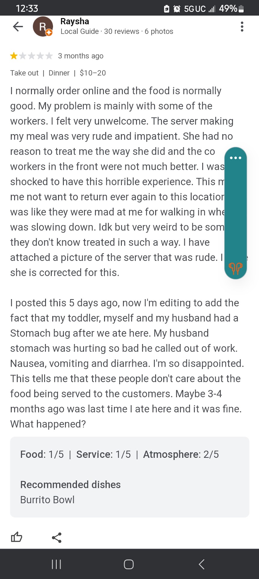 Read moreThis Chipotle is terrible. I visit it relatively frequently and place my order on the app and it is almost never ready at the promised time. I always end up having to wait an extra 15-30 mins. Today I placed my order on the app while I was waiting to checkout at Target because I knew this Chipotle store would not be on time. This was not my main issue this trip however. I ordered a burrito bowl on the app. The app said the store did not have any chips so I was only able to order a large queso. I figured if the store did have chips it would be an easy fix once I got there. WRONG! I asked the girl working the to go orders if I can get some chips because the app said you did not have any. She went to get the manager Miguel. I asked if he could just charge me the difference of the queso vs chips and queso bc the app said chips were not available or if he could just give me the chips for the inconvenience. He was extremely nasty. He said I had to ask for a refund on the which I had no idea how to do. Did not offer to show me or apologize for the inconvenience. He instead told me I can buy the chips and I would have to get in the back of the long line in the store for chips. That defeats the purpose of me ordering on the app. I just found him to be extremely nasty, no apology for the inconvenience. He acted as though I was a bother to him when all I wanted was some chips. I thought it was ridiculous to possibly lose a customer over the cost difference of a dollar and some change. Please look into new management (Miguel) and staff at this location because the service is always...
