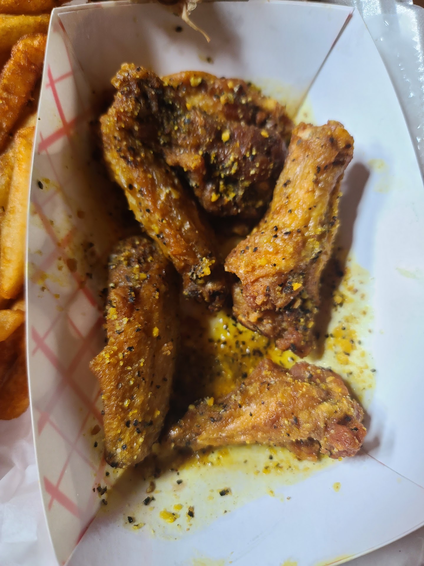 Read moreFood is fantastic. We love the wings and fries. Menu has a huge selection with good prices. We've gotten take out from here several times since the Covid 19 lockdown started. Service is iffy, last time I called to place a 50 wing order for takeout. Placed the order then received a call back from the cashier stating that the cooks would not prepare the order until we got there and paid because they didn't want to make the order then get stiffed because it was a "big" order. 50 wings with fries is around $36. Why take call in phone orders? I've placed larger to go orders elsewhere and had no problems. My first job was at a local, non chain, wing cafe and we never refused a call in order, even large ones. Tonight we went into the restaurant to place an order to avoid the call in hassle. None of the employees were wearing masks or sanitizing after handling payment from customer. The cashier seems to need more training. I ordered our 50 piece and an additional 20 piece of another flavor, she tried to combine the order at first and I had to explain I wanted an additional 20 piece, not 30 of one flavor and 20 of another. She rang me up then I looked at the ticket when I sat down to wait, she didn't ring up my 20 piece at all. Had to go back up and put in my 2nd order. She put my name different on both of the tickets, adding to the confusion. She told me 15 mintues, it was 30 minutes before my food was ready. Due to the 2 different tickets with 2 different names, they couldn't figure which orders all belonged to me when bagging. While I waited, I watched her struggle to input other's orders into the computer. She was friendly and so was the other girl working the front, just really seem to need more training. Inside was bright and clean, I'd like to eat in there when we can again. Food was great...