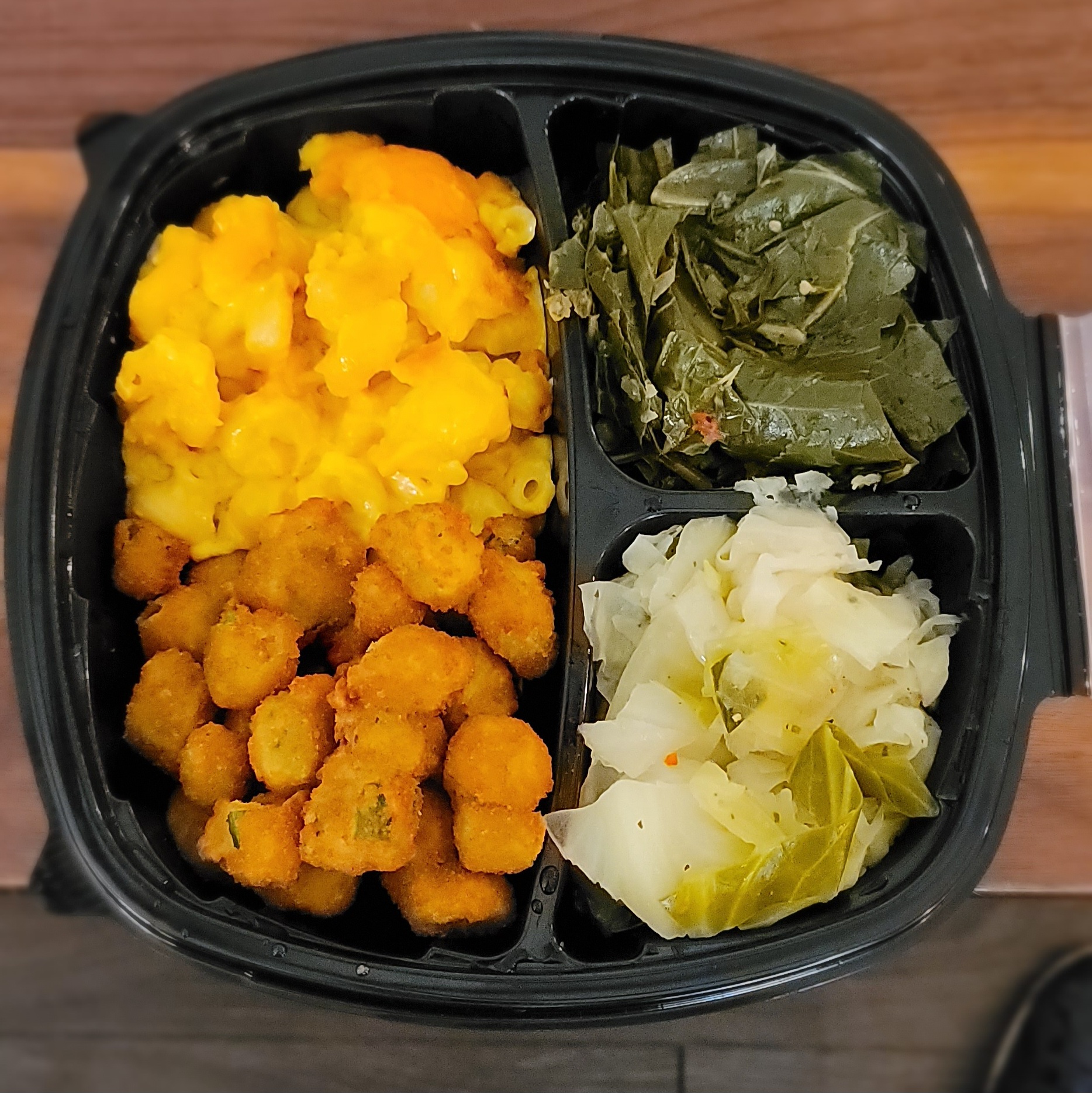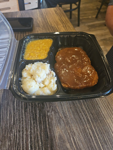 My wife and I were so excited to try this place. The staff was very friendly and the place is decorated nice and clean….BUT!!!!!!! . When the lady brought our food to the table there was a long hair sitting on top… not in the food but on top of the container. I ordered the buttermilk chicken tenders with green beans and a side portion of meatloaf and Mac and cheese. My wife ordered the fried catfish with dressing and Mac and cheese. The only thing that tasted good was the chicken tenders. The Mac and cheese tasted like Kraft velveeta made with sour milk. None of the food has any seasoning, it tasted like hospital food. Instant mashed potatoes, dressing tasted and looked like baby food… I’m not exaggerating any details. Meatloaf looked like it came out of a can of dog food. The taste was not bad but it looked and had the consistency of a can of dog food. If I was to go back it would be for the chicken...