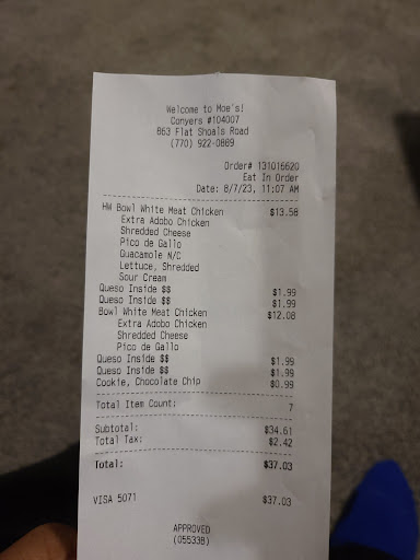 Original Post 2/2024: Wow. I rarely come to Moe's. Chipotle is my go to because they have better service. I should've known this was going to be bad when no one said "Welcome to Moe's ". The young lady acted as if she didn't want to serve. I don't expect service with a smile, but I don't want to be treated as I'm an annoyance. I'm the only one in the restaurant at 11am beating the lunch rush. She acted funny when I asked for queso. Moe's is known for their Queso and Ms Lady was being hellas stingy. C'mon ma'am, hook me up with the Queso. They use the smallest scoops to add items into the burrito bowl. The dark meat chicken is dry. I recommend getting a drink. The rice, corn, sauteed onions with peppers, and queso was the saving grace for this review. They quadruple charged me for queso when all I assked was for a smidget more of queso. CHIPOTLE is the BETTER option for a reason. Dayamn Moe's, today was not your day today. I will revisit in 2024. Hopefully the Conyers Ga-20 Location get it...