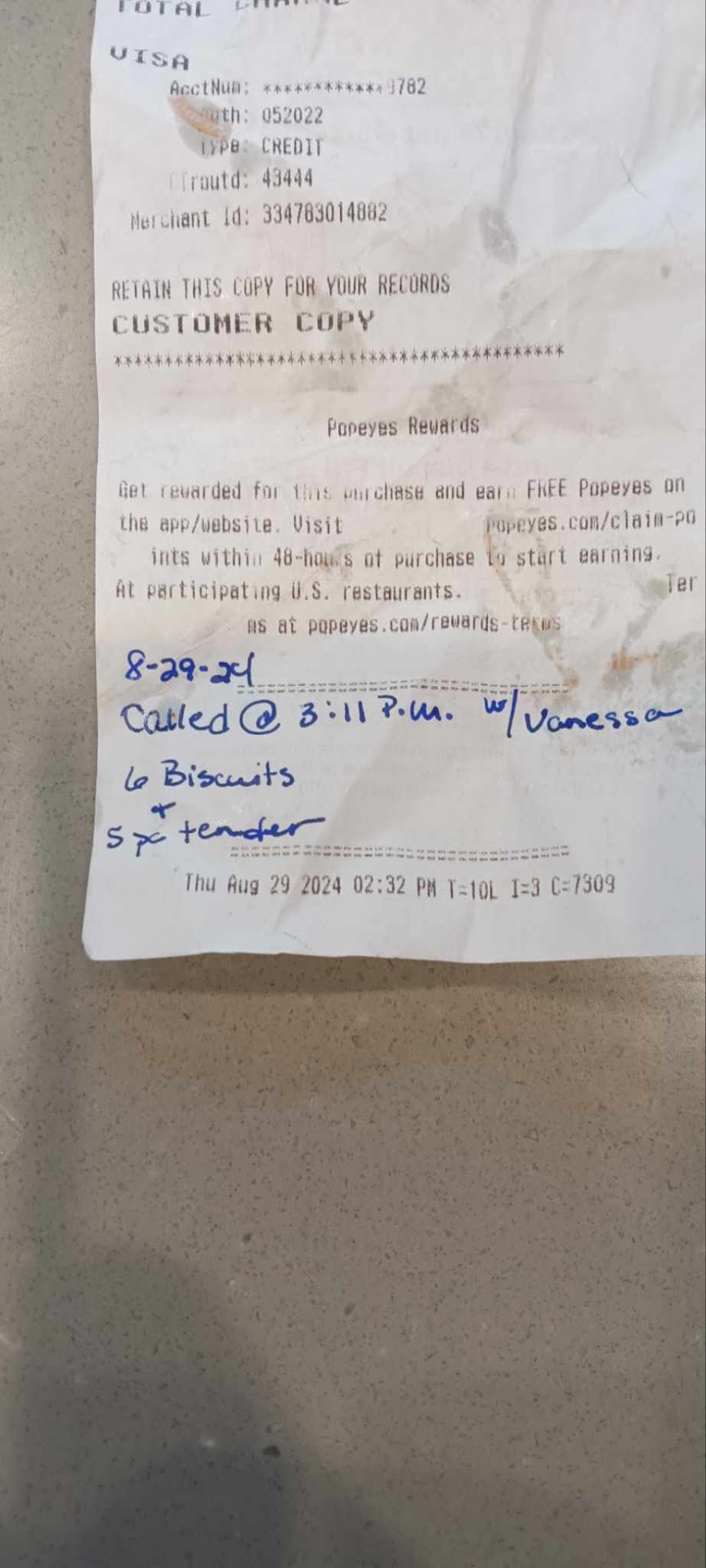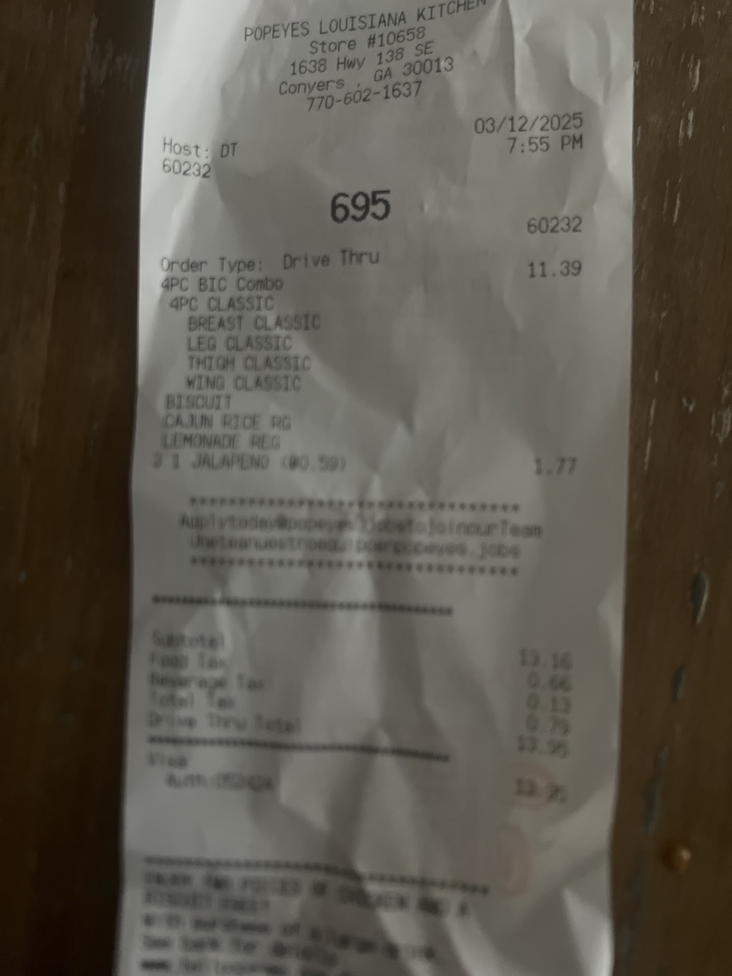 Read moreI just updated to two stars. Consistently out of menu items, can’t keep up with demand resulting in 30-60 minute wait times for chicken, rude employees, disgustingly unclean dining area and a manager who apparently doesn’t enjoy her work. During our 35 minute wait for our order we saw multiple customers ask for refunds. They were out of all dipping sauces but didn’t tell customers until they got their order. The cashier was so lazy she couldn’t take three steps to her right to get the receipt and hand it to me…”your receipt is over there” she muttered. She was just plain rude and she is the face of Popeyes. I could you led go on but I’d recommend driving on to another restaurant, KFC is just down the road. I used to “love that chicken from Popeyes” but not from this store.