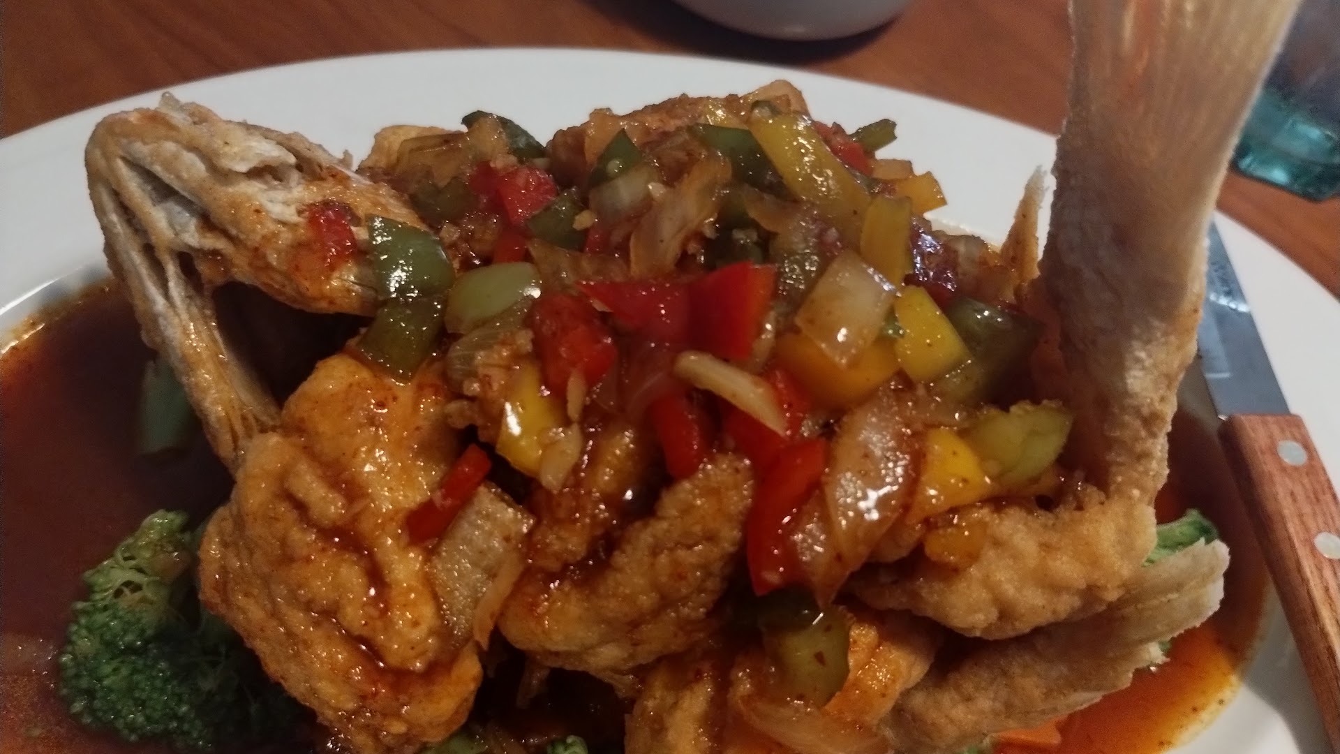 The green curry was a little too sweet for my taste preferences, which made it exactly right for my bride. The seafood dish was a little bland and not very balanced in the mix of "fishes" (squid rings were nicely, firmly chewy - not rubbery). The fried rice was okay - good amount of pork.