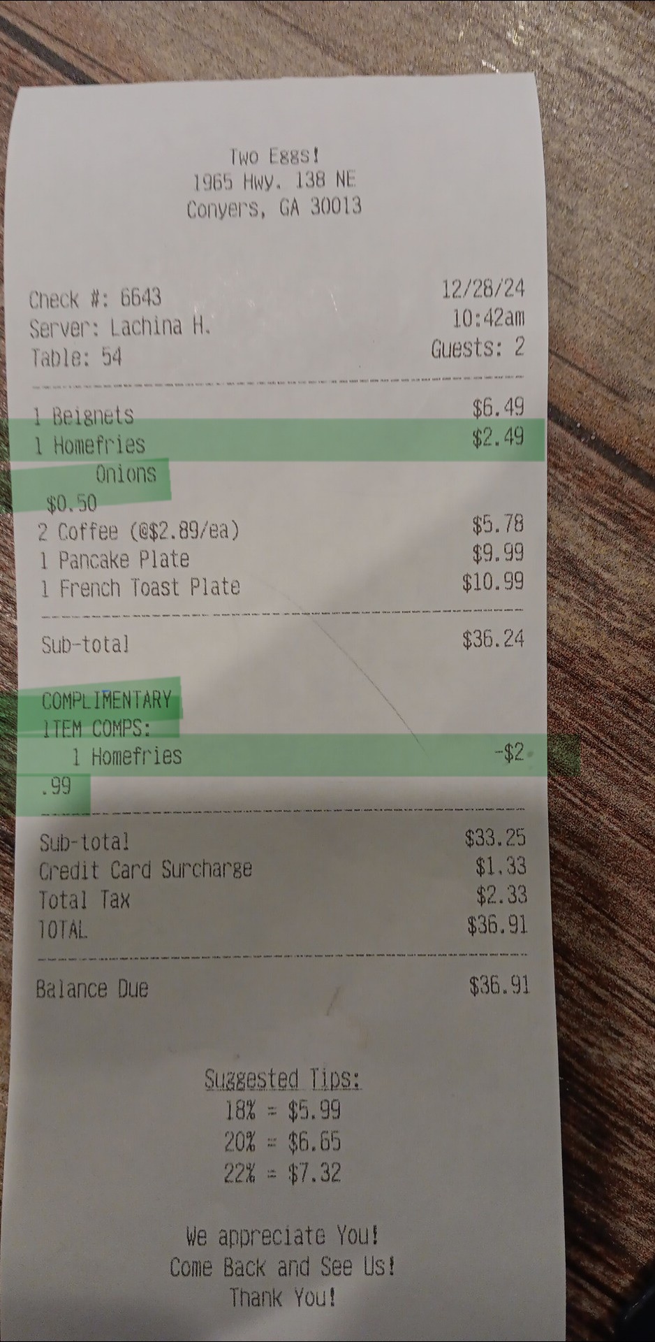 Earlier today, after my fiancée and I attended our daughter’s school award ceremony, our daughter chose to eat at Two Eggs in Conyers to celebrate. What started as a proud and joyful moment quickly spiraled into one of the worst dining experiences we’ve ever had.