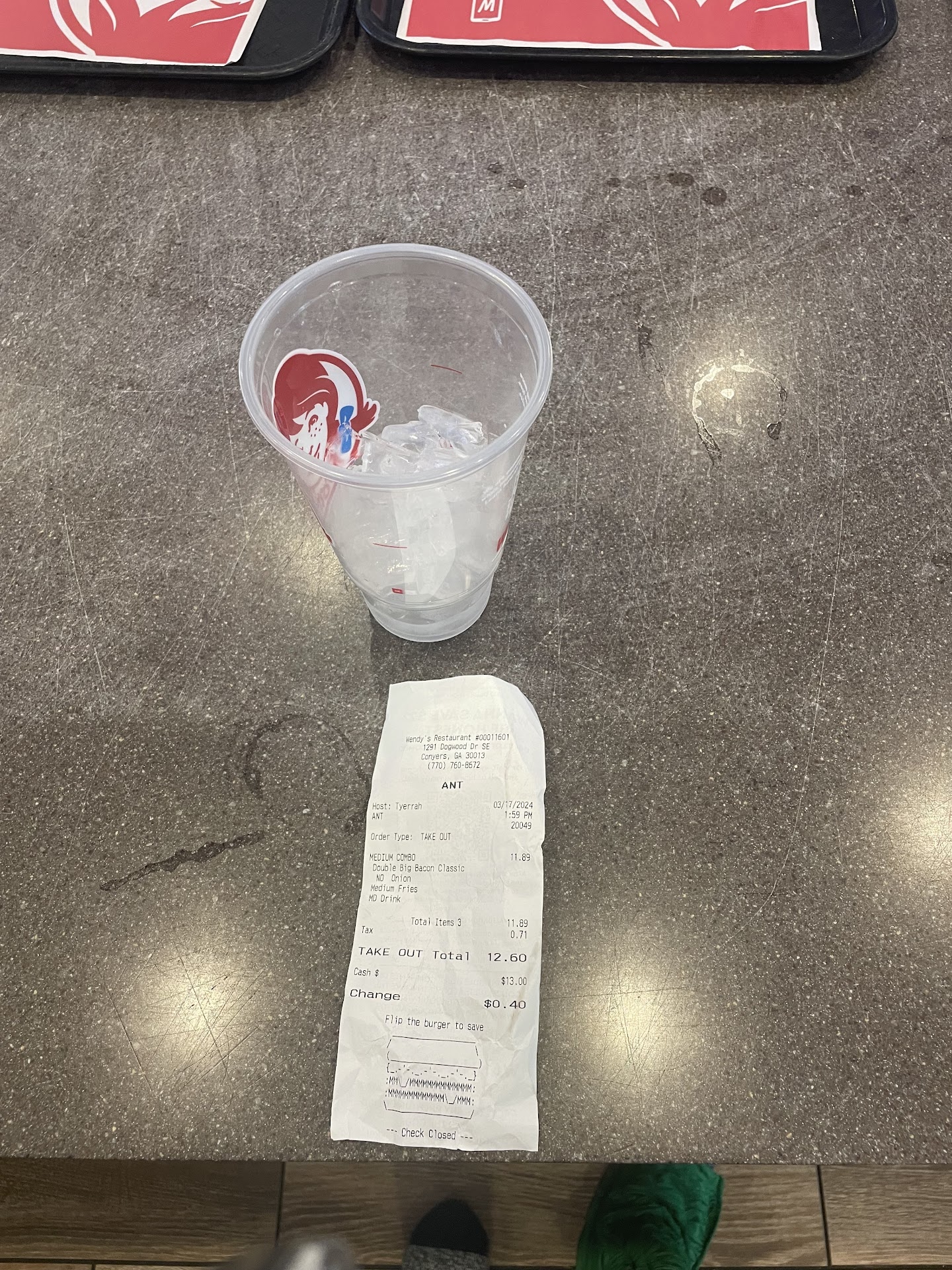 I went to Wendyâs on March 17th for lunch break. The cashier Tyerrah just did not want to be there. That is fine with me. I get it. Not everyone wants a job. I asked for a refund. She said âI been calling yâall this whole timeâ. I said calmly that I had to go back to work and I want my refund. She said just move to the side and Iâll do it later. It has been a while since sheâs addressed me and she has been taking multiple orders instead of giving me my refund. I also noticed she had been messing orders up that had been taken after mine . The order was placed at 1:59. It is currently 2:31 and I still have been waiting at the front to receive my refund. I have the receipt ,cup , what more should I provide? I donât understand why she would be the first face to see if she does not want to be there. ALSO she is very much pregnant so to follow me to my car to yell at me about leaving a cup at the counter is very dangerous. â NEXT TIME THROW THE CUP AWAY !â She yelled in the restaurant at 3:00 about a cup being on the counter. Yelled in front of the other customers that were dining in. I left the cup and the receipt on the counter (picture below) so I could get my FULL refund. The manager did not excuse her behavior and let this very pregnant girl follow me to my car to continue yelling. Very dangerous situation had I been afraid for my life. I feel sorry for her honestly. Next time have some professionalism at your job. The cup wouldnât have been there if the tea had been restocked in the first place it was 2pm. Why was there no tea ?? None of this wouldâve happened if she knew how to do her job. Following me outside was the icing on the cake. Tyerrah do your job and get the orders accurately so youâll be able to avoid as many problems as I saw today within the hour I sat there waiting on the refund. Just 12 dollars and 60 cent. I was never rude not once. I guess she was triggered into having to do her job . But I will be calling corporate as soon as they open. Her behavior, work ethic , and attitude were unacceptable. Iâll make sure she is held accountable for her actions since she wanted to make a scene. I hope the next person she follows outside gives her the exact reaction sheâs looking for. You would think she would want to be safe considering sheâs carrying a child. But you canât teach...