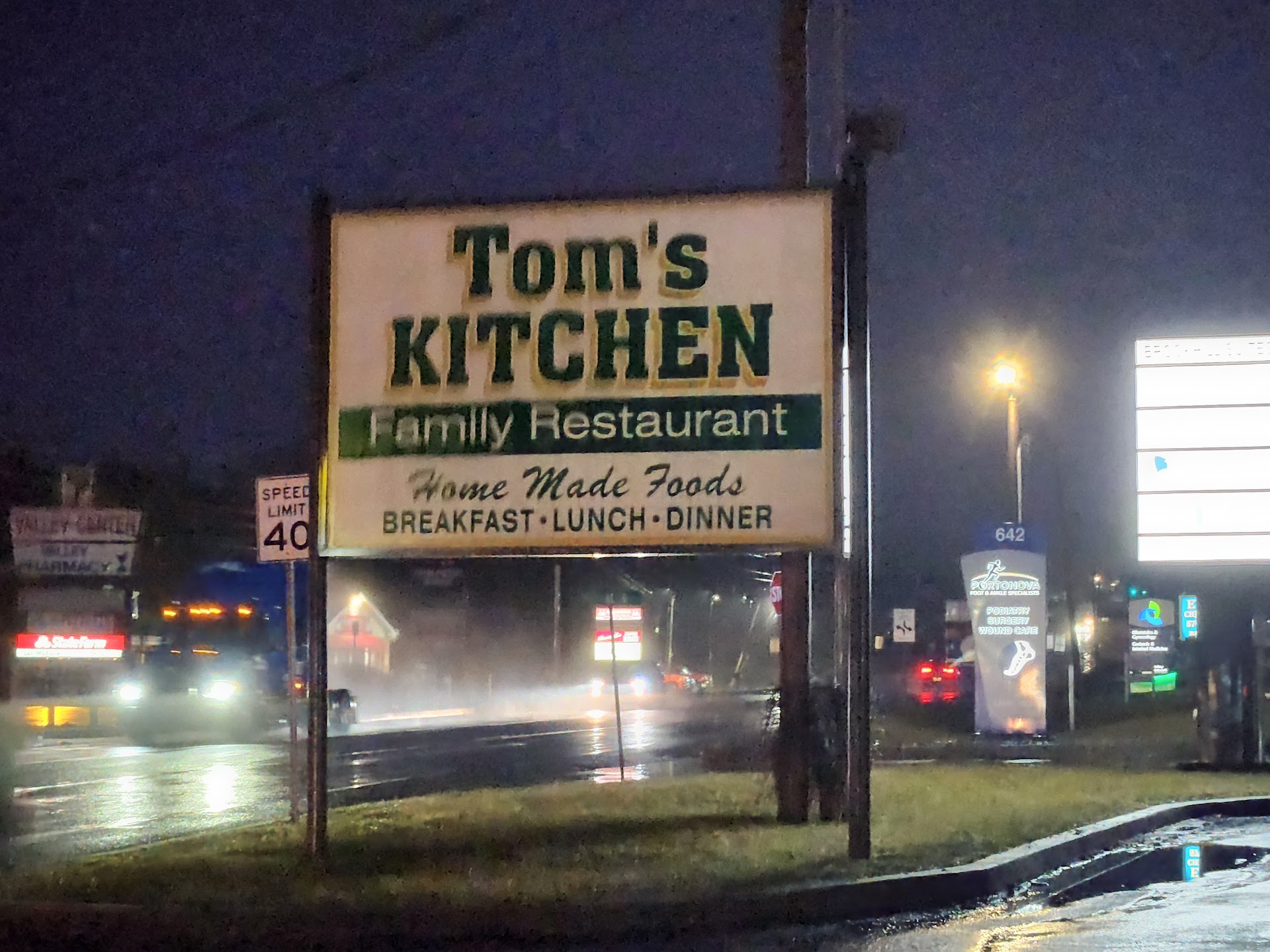 Read moreStopped at Tom's kitchen this evening for supper. Some friends told us it was a good place to eat. Well if I could give it 0 stars I would. I ordered the special, double lobed stuff chicken breast. I seen other platters come put before mine and was pleased with what I ordered. When mine came out it was half of what was on other diners platters. If the total weight if the chicken and stuffing was 3 oz. I would be exaggerating. Said they ran out of mashed potatoes, how do you run out of mashed potatoes? I orderd the baked potatoe, It was cold. I ordered applesauce and I had to ask if I was getting it with my meal. Waitress said it was ready she just forgot it. I add they were not very busy. My wife order the chicken parm. With salid. Came with spaghetti. The salid came out and was brown, wilted and soggie. She could not eat it. Should have been thrown in the trash. I was worried that if she ate it she would have been sick. The chicken was ok but the spaghetti was dried out to the point that some of it was hard. We will never step foot in the restarunt ever in fear...