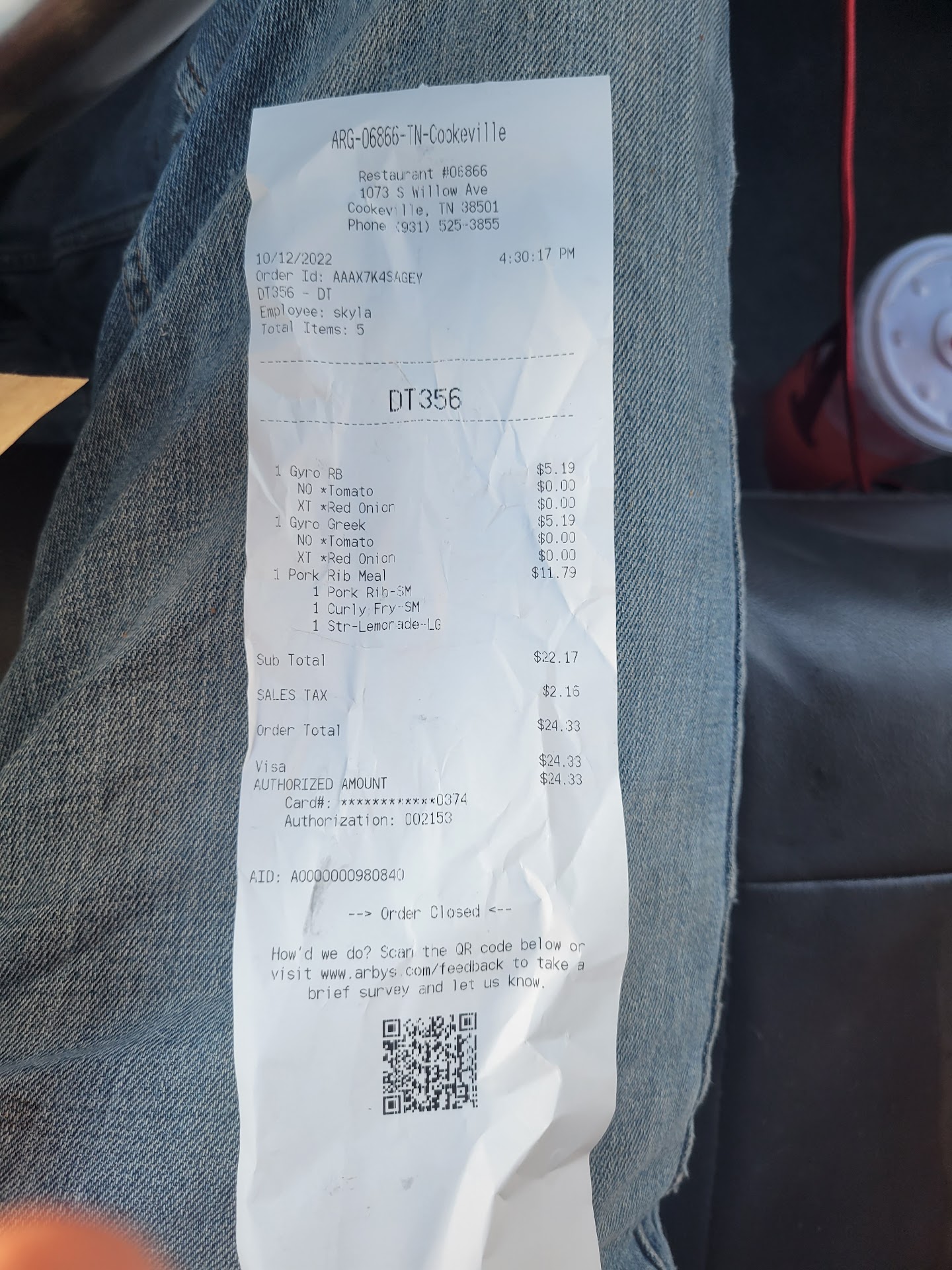 Read moreDon't bother to stop here at this Arby's in Cookeville TN! They screwed up our order terribly! We ordered 2 classic meals with crinkle fries and 2 diet Dr. Peppers. To me this order sounds easy, right. Wrong! We got our drinks, fine. As we were driving away I checked our order. We only had one sandwich after paying for 2, ($16.00). We drove back atound to drive- thru, told the woman that we only had one Classic sandwich. As I was handing out our food, I noticed that the wrappers were different. My husband got the Classic, I ended up with a Classic/cheddar cheese with sauce and a onion bun! It was awful. I ended up picking the beef off and eating that! We will NOT be stopping here again. This makes twice that they have messed up our...
