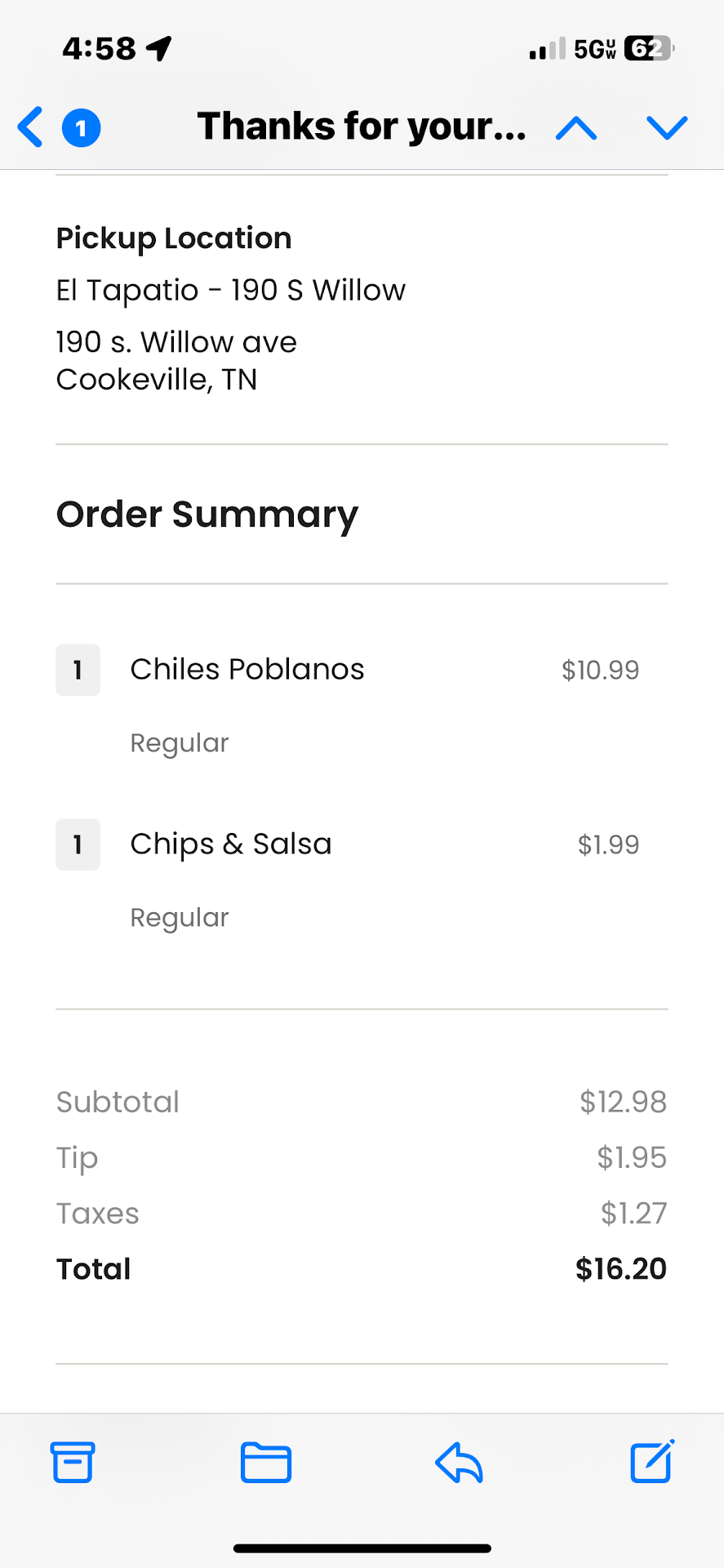 Do not order from the website, call it in. I order the same thing every time. Chili Poblano plate ( two poblano chilies, and rice and beans) $10.99 Added side of chips and salsa for $1.99. I’ve ordered this four times in the last three months. Pretty much my favorite Mexican dish. First time not a problem came through perfect. Second time ordered it and it came at half portion, but paid full price. Third time again came half portion but paid full price. This last time they made two chili Poblanobut had no rice and beans. Apparently, when the ticket gets printed out in the kitchen, it just print out as to poblano’s.