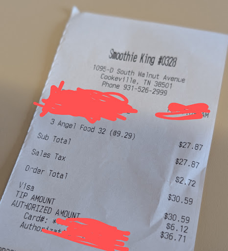 Read moreJust the other day...I can’t believe I paid $36.71 for 3 medium smoothies. No add-ons, just the basic Angel Food as they call it (strawberry + banana). That’s $9.29 each before tax and tip. It's completely ridiculous for what amounts to fruit, ice, and a blender.