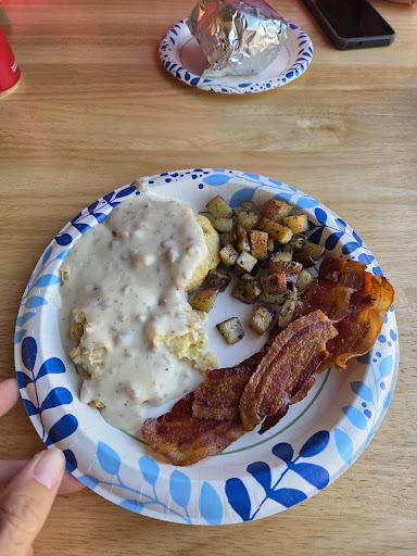 This place is now one of the only two places Iโll get biscuits and gravy from. Potato casserole was also delicious. Bacon cooked, perfect and eggs made to order.