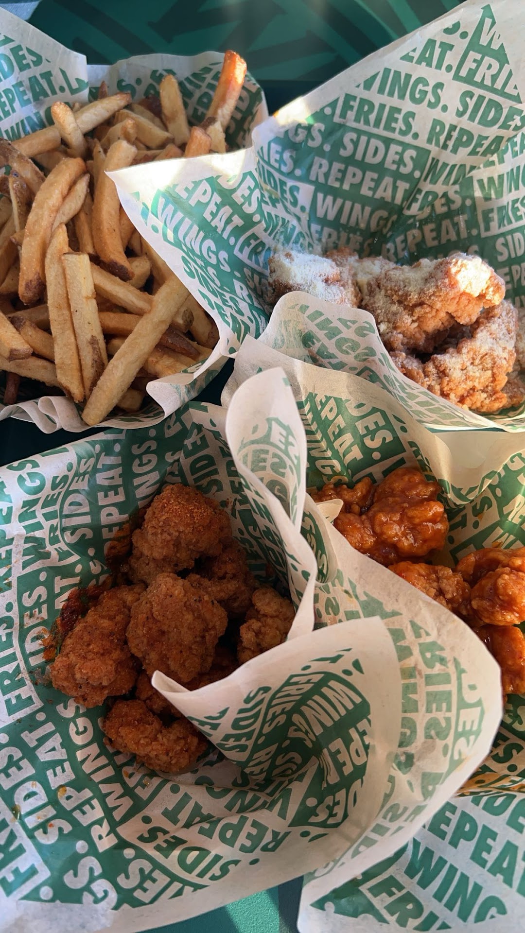 FOOD: Any and all chicken products we ordered, (chicken sandwich, a large variety of wings) came out great. Crispy on the outside, tender and juicy on the inside. The fries however....completely raw. I don't know if someone was new and training on fryer, or just in that big of a rush to get orders out (place wasn't that busy) but the fries themselves were absolute mush. So much to the point that when I finally got home I turned the airfryer on, tried cooking them at 450 degrees for 10 minutes. They were still limp and very moist. At this point I gave up cause I had already finished the rest of my meal and the experience left me aggravated enough.