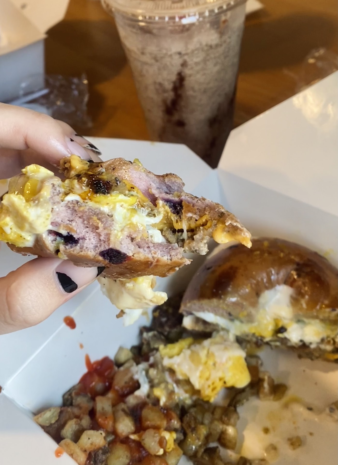 The sandwiches are both breakfast bagel sandwiches with home fries! (Cheddar jalapeño bagel, scrambled eggs with sausage and a blueberry bagel with sunny side up and sausage.) A beautifully crafted sandwich made with fresh ingredients. You can definitely taste the love Todd puts in them. 💕 hubs had to go back for a second sandwich because it was so good. Bagels are made fresh and delivered everyday!