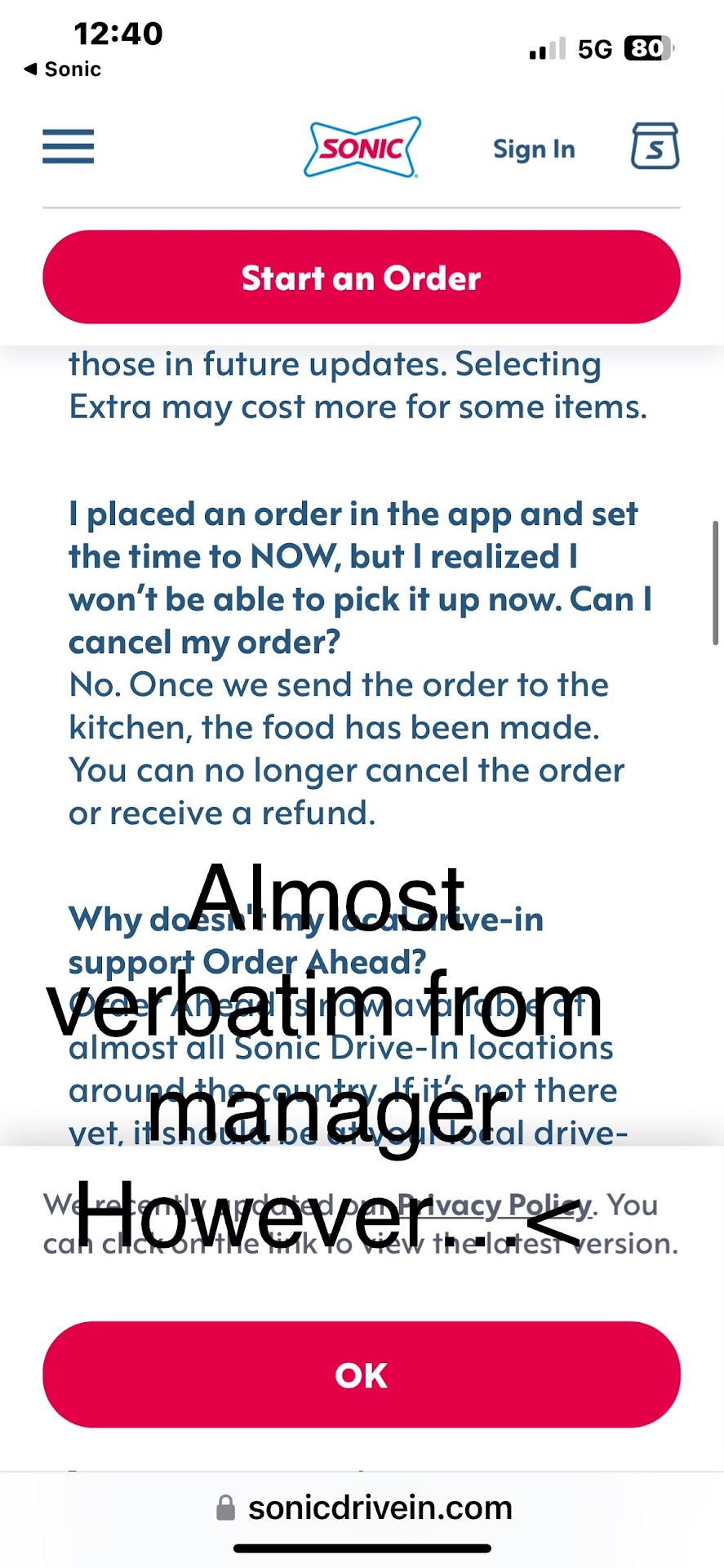 What I didnāt anticipate is I ordered a Route 44 Powerade blue slush - keep in mind; Iāve reported that every single sonic is THE SAME with not just the WORST internet but NONEXISTENT as though you have a jam on the phone - no other place have I been that does that yet wants us to share location and the only way to pay ApplePay AND the app is why my route 44 slush is under $2