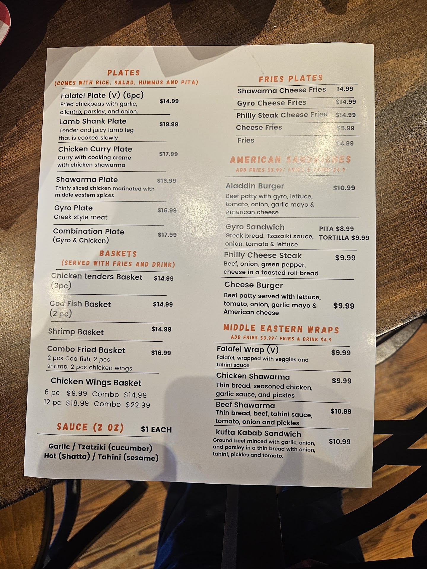 Read moreI visited Aladdin Grill on a Monday after my Dental appointment. I reviewed the menu and elected to have the Falafel Meal to go. The first issue was the price difference from the menu, I mentioned the dollar extra the system charged me. Then I showed him on the receipt, but I still didn't get my money back. So, everyone ordering the Falafel meal will be getting ripped off an extra dollar. Who knows what other items people are being over charged. Second, luckily, I checked the content of my order. The menu stated I received a pita bread, which was missing. Plus, there are no napkins, fork, or other utensils on my to go order. Third, thanks to the mother, she grabbed the container and added the sauce over the Falafel and rice. A nice gesture, they offered chick pea soup to customers for free that day! Yes, someone mentioned Homemade Hummus? I didn't get a flavor, sort of tasteless. Normally, I would have taken a photo of my food, I was already disappointed with overpayment, no pita, forgetting the sauce and little portions of the salad and hummus that I haven't mentioned. Now the last point about the Dental. WHO PUTS A OLIVE WITH A " PIT " ON TOP OF HUMMUS? A two hour and fifteen minutes drive to the dentist to get my teeth checked out, cleaned, and I decided to get food at your restaurant to chomp down on a block olive with a pit! I thought it was from the salad.