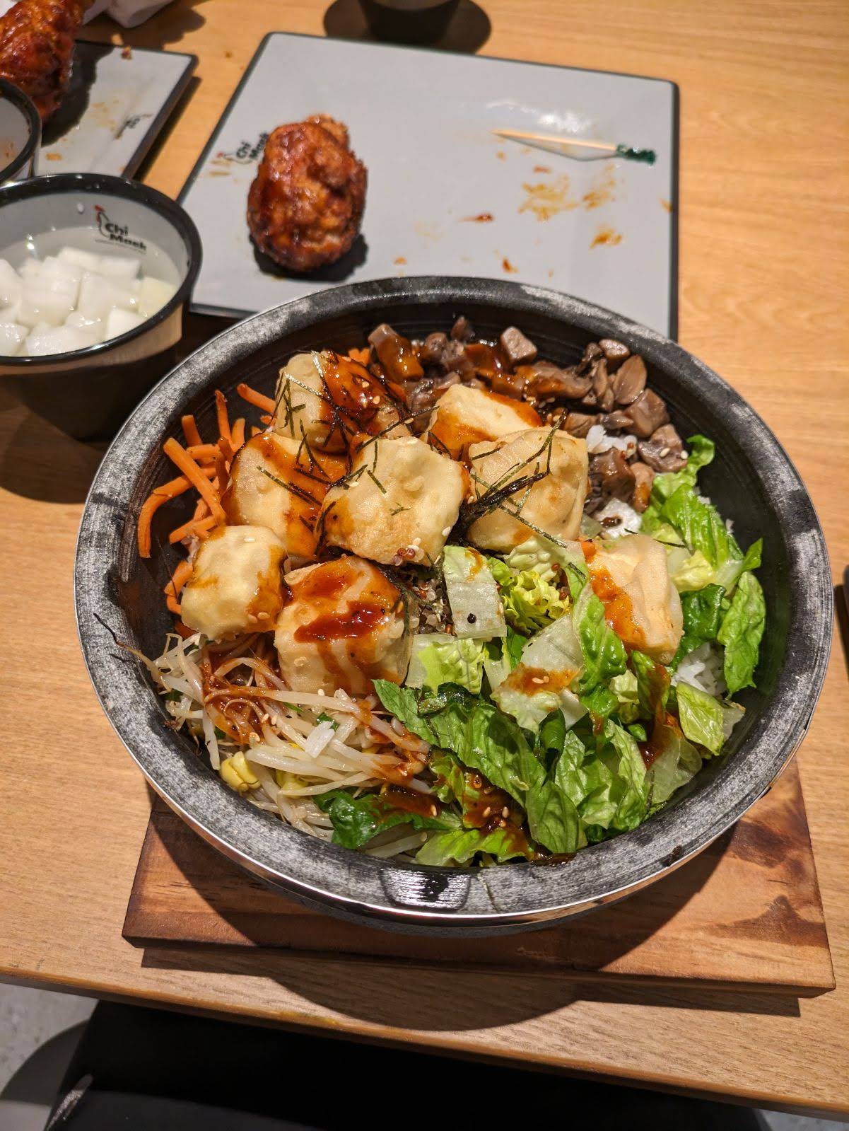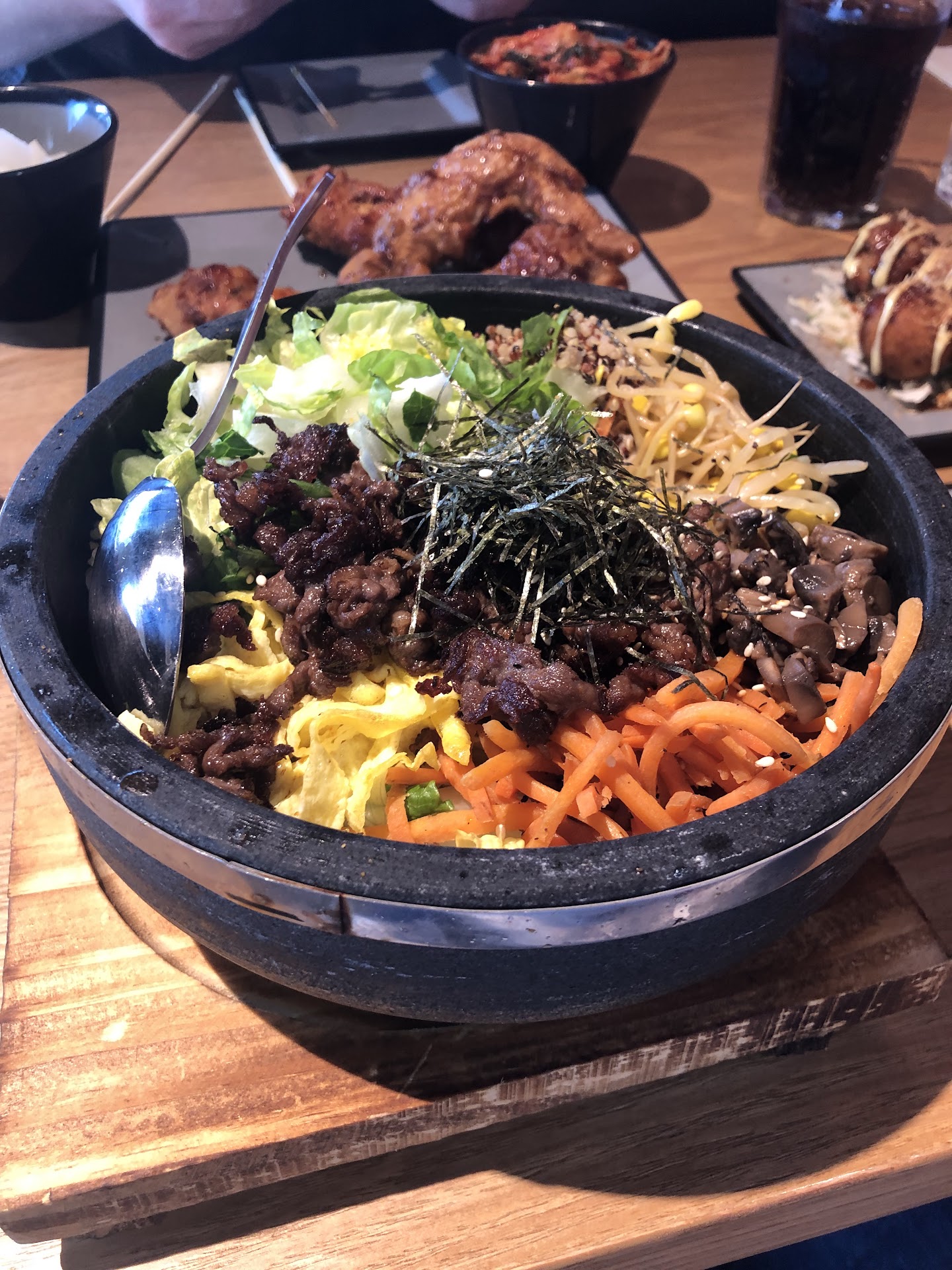 Food: We ordered the drumsticks, house pickles, rice, and tofu bibimbap. The house pickles were good. The rice was lower quality jasmine rice, similar to that at a Chinese take out. The chicken had good crisp and the spicy sauce had excellent flavor and was spicy. However, the drumsticks were large and assumedly from fast growing broiler chickens, so they were white meant and the meat felt rubbery. I would much prefer the smaller, more flavor drumsticks that generally come from slower growing chickens. By wife said the bibimbap was okay, using the same rice and packaged fried tofu.