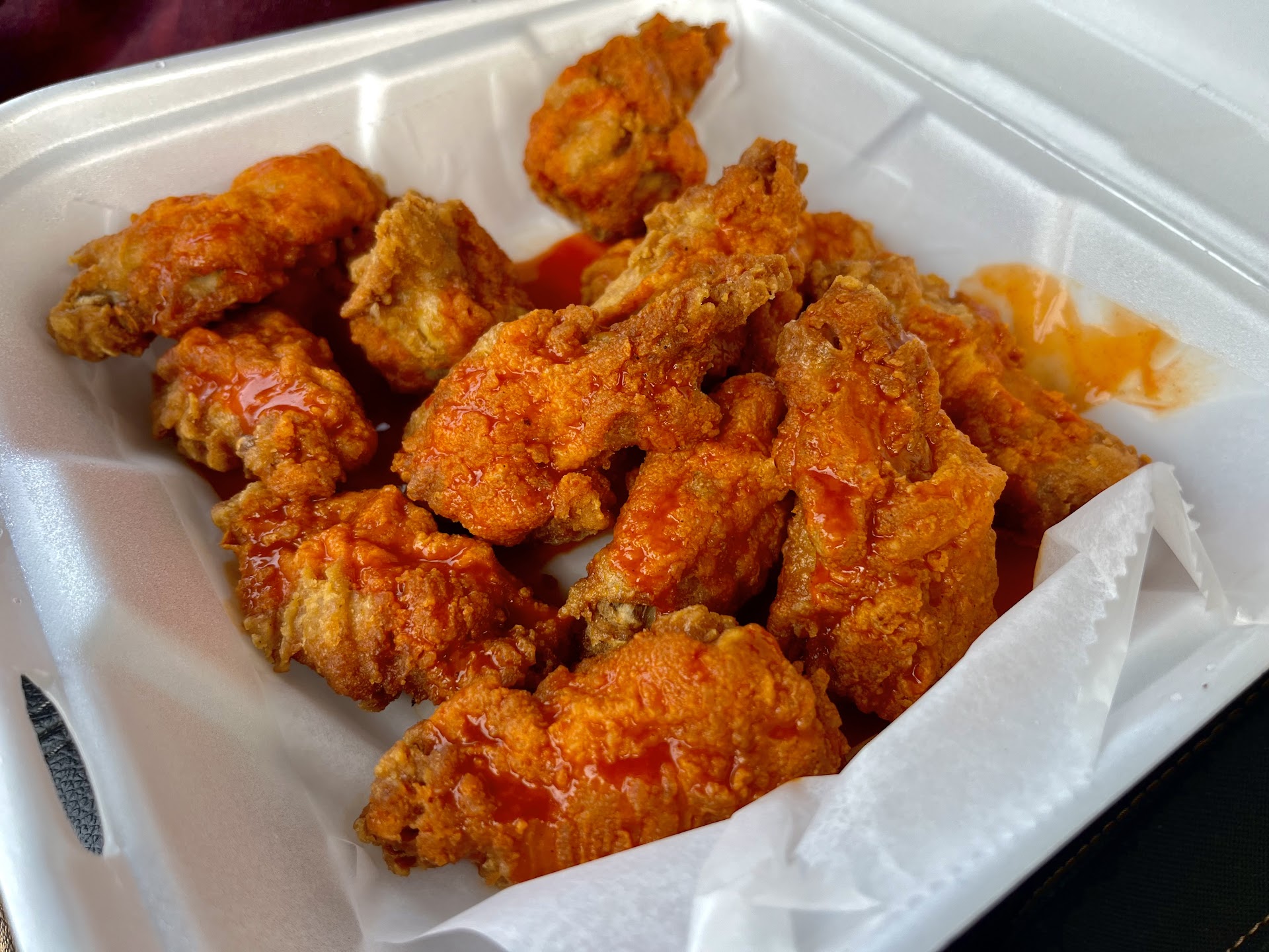 I also tried the wings, not expecting much, but I was pleasantly surprised. I got Jamaican Jerk and the smell wasn't unpleasant, but was throwing me off a little. Then I bit in and it all made sense. The flavor was a bit tangy and overall enjoyed. Hard to describe, but I'm going to buy these wings again and try another flavor, seeing as how the Jamaican was good. The wings were cooked very, very good. They were juicy and the skin was just a bit crispy. I'd say they were much better than any wings I've had here in Anoka. The price is...