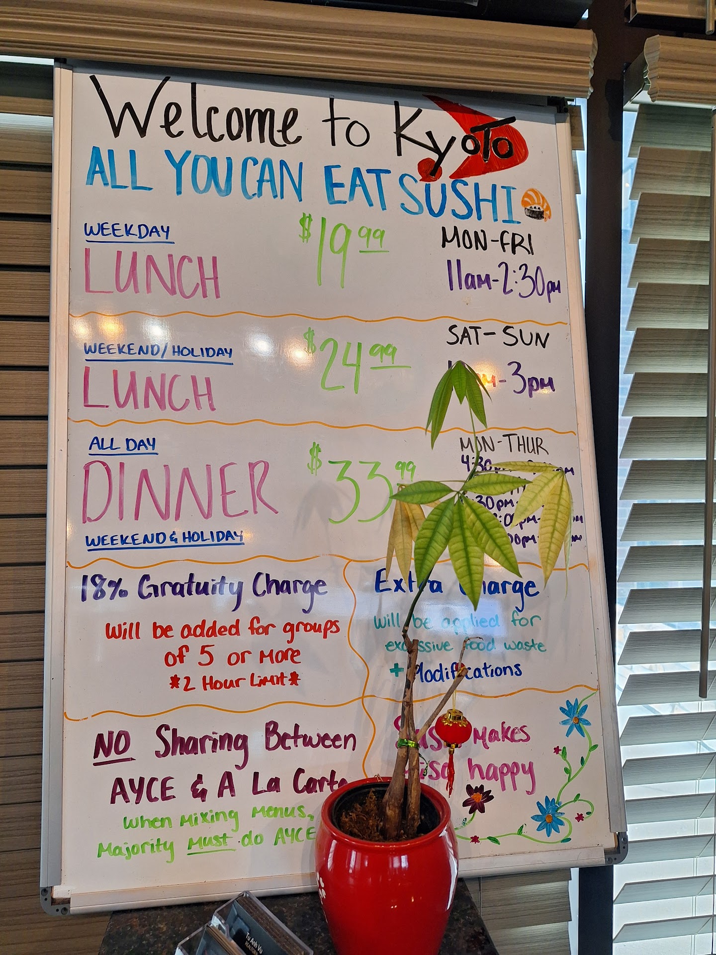 Read moreWe were in the mood for sushi and the restaurant we planned to go to was closed, so we looked for others and found this one. We arrived and were seated, but after a seemingly long time of not being greeted by a server or given a glass of water, I asked the host if a server was assigned to our table. He went and got her, and from then on, service was okay. My real concern about this experience was what we got for the price (a well over $100 meal for two after tax and tip). If this sushi meal had been a $12.99/person deal at one of the buffet places, I'd have thought it was fine, but it is not what I expect when I pay for what should be especially good sushi at a place known for sushi. When it is over $33 per person, it is just unacceptable. We have eaten at other Kyoto Sushi locations in the past and thought they were fine, so I don't know what happened here. The food wasn't bad; it just wasn't as good as it should have been for the price. The appetizers and other non-sushi items we ordered were okay, but not outstanding. The atmosphere was a bit too loud for our taste. Sushi places shouldn't be loud. We certainly won't go back to this location, and with known better options, we will be hesitant to go to any Kyoto Sushi...