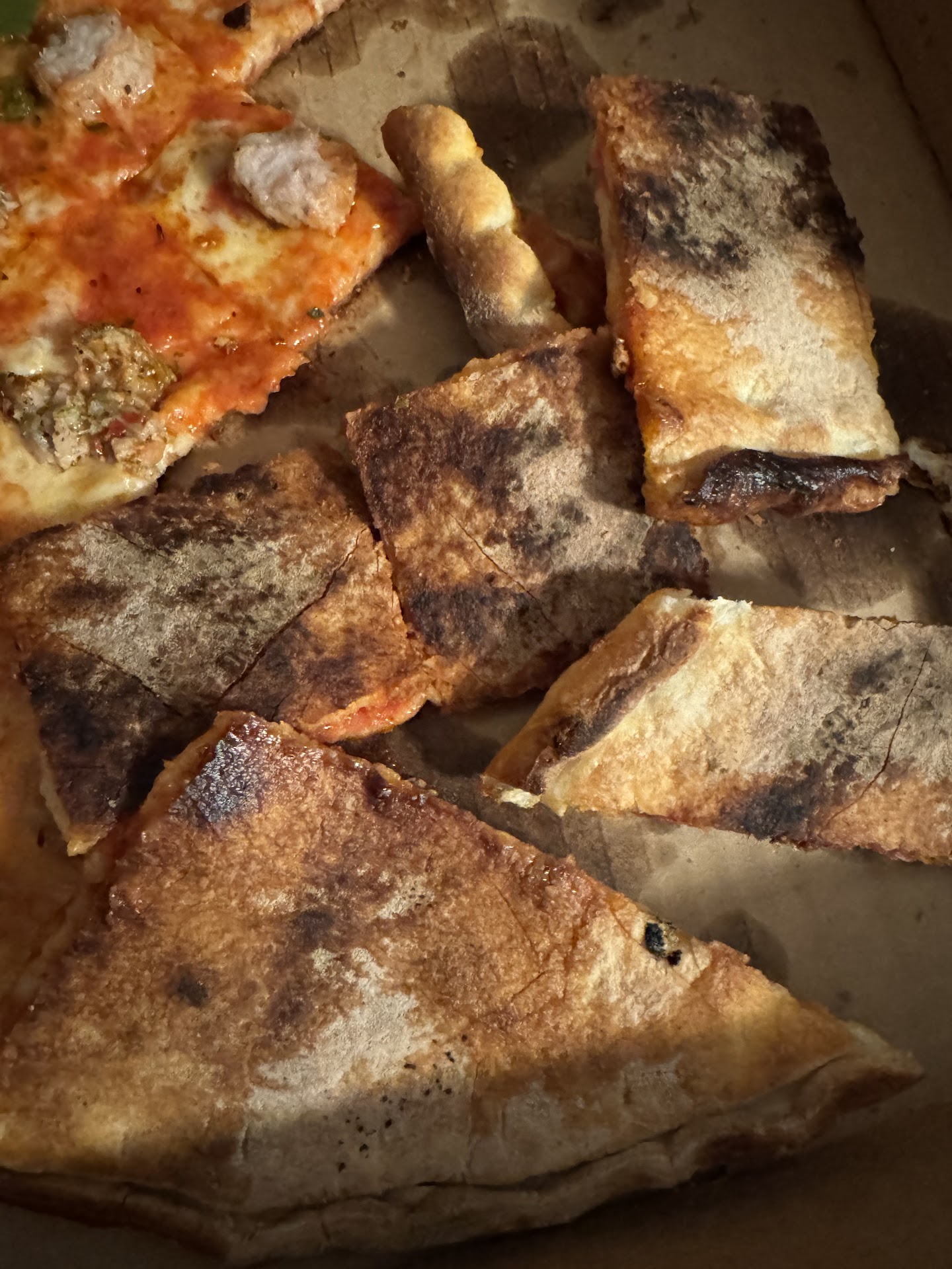 Food: Very nice pizza basics; good sauce, good crust, good cheese. They take a traditional approach by going light and balanced, not heavy and overpowering like other pizzas. The crust was thin and hand-made, and didn't taste like a saltine. (they usually do to me) The cheese was of good quality, and the sauce was a very nice and light marinara. The pizza did have a good bit of oil, but not Pizza Hut level. It was just right. Overall it was a very good pizza. Not a big fan of the checkerboard cut, but that can probbably be remedied by asking for a pie cut. The only problem I have with it is...