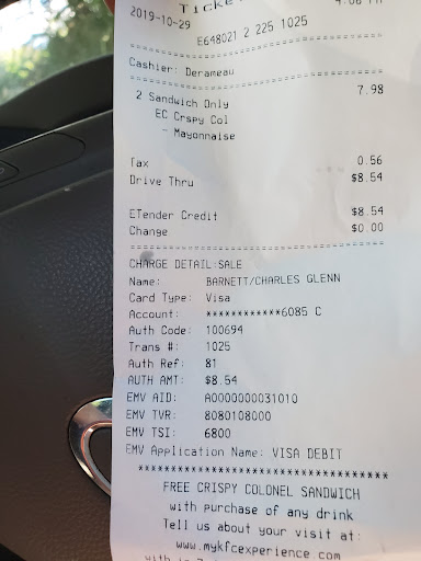 Read moreWent to this KFC for lunch with my work crew and ordered an 8 piece meal. I asked the woman taking my order (who also happened to be a 'manager') if they had enough to make the bucket all dark meat. She rudely replied with "I dont know, if not you're just going to have to take whatever mix we give you." We ended up receiving a mix. Now, most of us have eaten at a KFC before so I'm sure you are all familiar with the units the chicken is kept in... because it has a glass door... and it's behind the registers... in plain view... Point is. As far as we saw, there was enough for what we asked and no effort was made. Mix that with the rude employee and a not so clean customer area. I do not reccomend this...