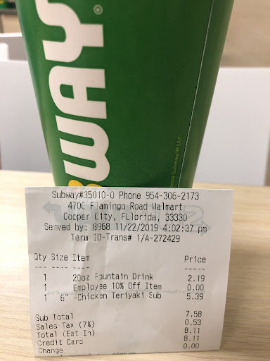 Read moreWe get 10% discount at this Subway location and when I was paying for my sandwich I requested it and the cashier didn’t know what to do so she called another employee and she started typing something and left. Then the cashier finish the transaction and gave me the receipt. When I sat down to eat I checked it and I noticed she never gave the discount. What offense me it’s that she lied 🤥 when she pretended typing something I thought she was going to giving me the discount. She should’ve told she won’t or she can’t give it to me and be at front. No coming back...