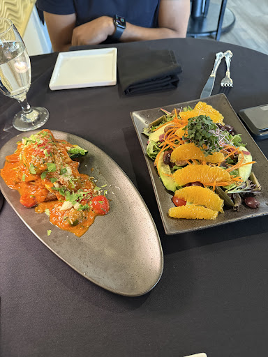 To start from the very top: ⁃ When the appetizers came out we were very confused because half of the ingredients under the items listed on the menu were not there. For example, the signature appetizer, Zupetta, was supposed to be a focaccia and vegetable plate. It was missing the focaccia and bits of the vegan cheese were ice cold. The local wild mushrooms & duo of orange salad was supposed to come with wild mushroom, oranges, and orange jelly. The wild mushrooms (the literal main ingredient) and orange jelly were not present and the flavors in the dish did not go well together at all. We asked the server and she brought over the mushrooms and focaccia however the focaccia was extremely crumbly and didn’t taste fresh. Note: The sauce for the dish did in fact taste very good. ⁃ For the main dish we had ordered two signature dishes, nano risotto that was supposed to be flavored with truffle, and apple wood smoked vegetables with a mint and pea purée . Once again the risotto was missing the truffle (which the waitress acknowledged was a mistake on the chef’s part). For the apple wood smoke dish, instead of mint and pea puree it just had torn mint and peas on the top. This simple doesn’t work when the vegetables don’t have any flavor of their own. The dish was also extremely oily as seen in the pictures which was surprising considering the vegetables were grilled. The potatoes were burnt and the squash was overcooked and falling apart, the zucchini had grill marks on it but somehow wasn’t cooked all the way through. For what it’s worth, the risotto did taste good even without the truffle. ⁃ For dessert, we ordered a chilled duo of strawberry and jasmine soup, that was supposed to come with a strawberry sorbet. Instead we received ice water with melted sorbet, with chopped mint and a teaspoon of sorbet. No jasmine to be found. It was so gross we didn’t finish it.