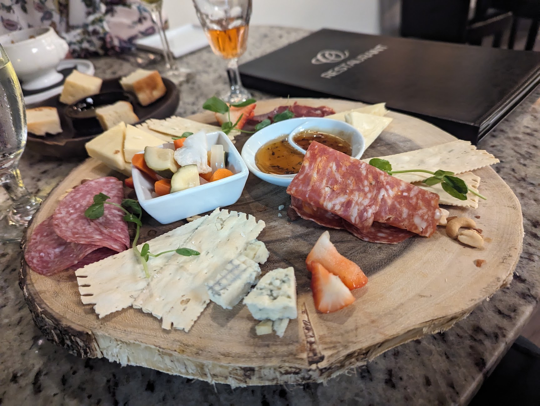 Our cheese plate came next. It was plated excellently, on a cut round of wood, and priced just as well. Various cheeses, meats, nuts, crackers, and some strawberries circled a tiny bowl of quick pickled veggies and another containing red pepper infused honey. If you end up at this restaurant and purchase nothing else, this plate is worth the inexpensive indulgence.