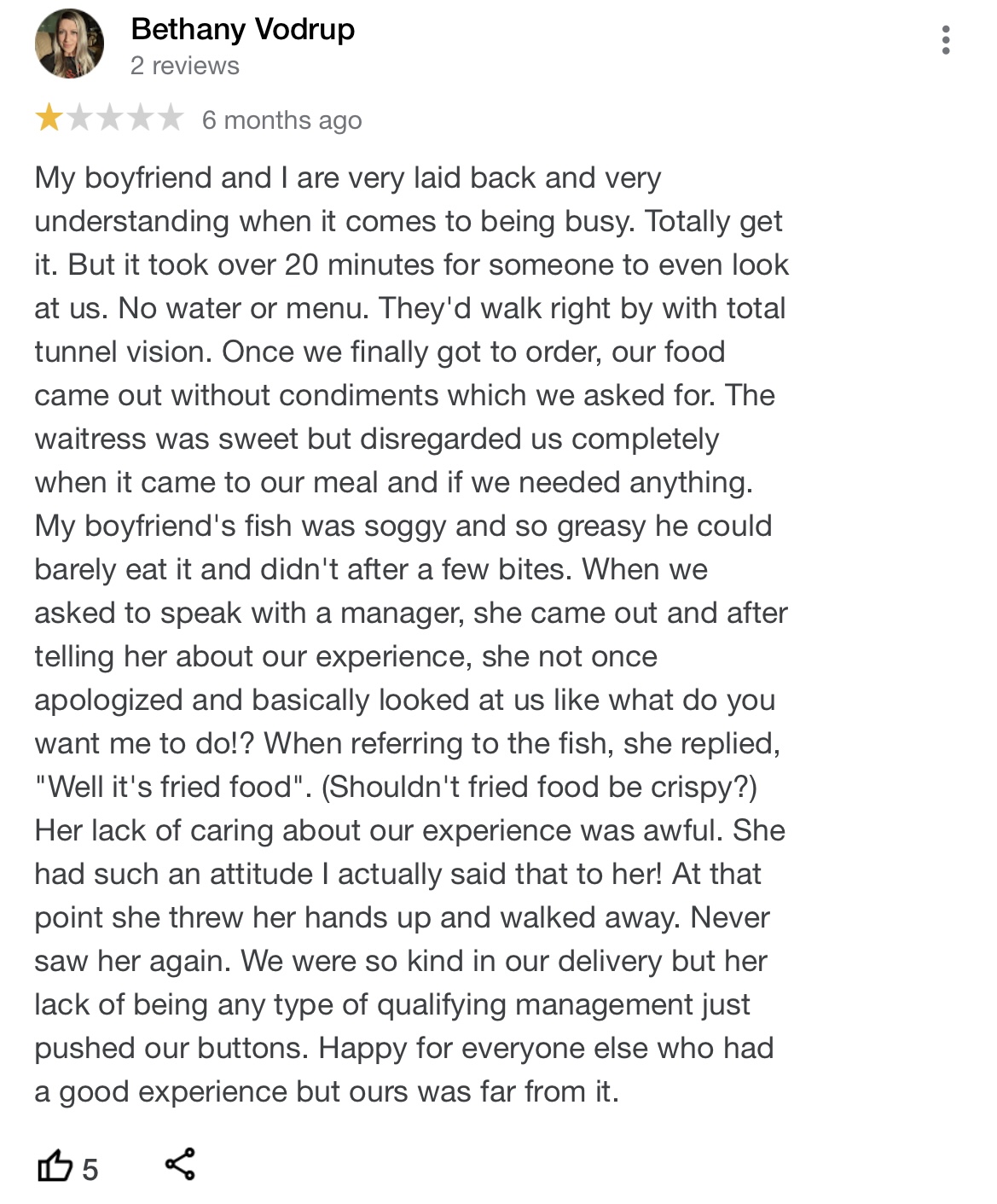 Read moreThe picture I'm posting was pretty much the same experience my husband and I just had at this establishment. I assume it's the same person but we, too, are both laid back and I have the day off today but he is working today but did have time to go out for lunch and suggested we go here for lunch (our first time here). We waited for quite a while to be greeted but after ordering, waited and waited and both acknowledged how long we had been waiting but remained patient. I asked my husband if he wanted me to ask them to make the food to go, at one point, because it had been 40 minutes and we waited some more and finally he said yes, that we would have to ask for it to go. I went to the counter to ask if it could be prepared to go (it still was hot ready to go out, at this point) wnd explained that my husband had to go back to work. When I was given the total, I very kindly asked if they were going to Lori hide any sort of discount for the wait and the server, Darla, said that she would need to go back and ask the manager/owner and came back out and said no, to which I was kind of shocked, actually, and at which point I told them that we would just get our food elsewhere. The manager comes out and insists that we have to pay for the entire order, mind you, that we had never received, to which my husband told her that we were going to leave. We started to walk away and the manager said that she was going to have to walk with us and call the police, never once apologizing for the wait and only being defensive.