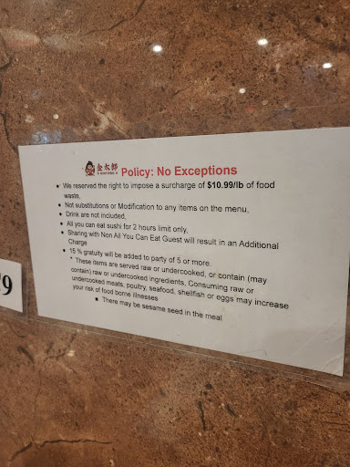 Read moreSo this was our first, and probably our last time going here. Red flags from the start. First we were sat at a dirty table, the next table wasnt much better. Host said nothing and walked away without any instruction or info,( instructions were needed for how to order at this place!) all that was there was a small cup with flowers sticking out and a drink menu. We sat there and waited for around 15 min for someone to come. ( waitress was the only good experience at this place) waitress came and was pleasant. Got our drink orders and gave us 2 sheets of paper with menu items on them. More time passes and the papers had some instructions, but not how the ordering process for all you can eat works. Waitress returns and gives us our drinks, and we explains how it works. You check the boxes of what you want, then someone comes and takes your sheet and prepares the food. ( The cup of flowers on the table were pens). They then also explained that if you dont finish your food you ordered that there will be a extra charge! Up too $11. So be careful ordering anything new because if you dont like it and dont finish it, you are charged again for it. Also there is a 2 hour limit. Didnt seem like a big deal at all, until we realized we were doing alot of waiting! First plate of food arrived at our table 40 min after being sat. Hubby can eat! So once we got our food he ordered his second plate asap. Food was subpar at best. Crab rangoon were void of any filling. Sushi was no better then grocery store premade. 1.5 hours from the time we sat and he was full. He had a few left over pieces of sushi (were not that great tasting!) he tried to finish but just couldn't. So yep we were charged for them even tho we had already paid for our meals, and drinks. $18 a person for all you can eat, drinks not included, tip, and extra charge for left over sushi we already paid for= $80+ Theres an all you can eat place in north Canton that for $40. We get the same stuff, faster, and no extra charge! It was an experience, but not one we will likely do again. Plus Hubby is now vomiting this morning. So definitely not on our list of places...