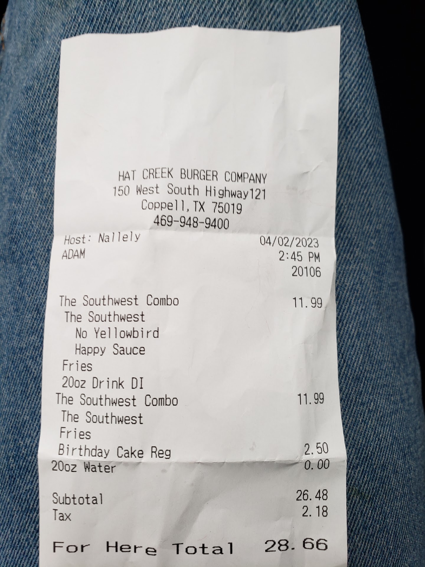 Ā Ā Ā Read moreThis was my first time at Hat Creek. We went through the drive thru (my children did not want to get out of the car and we had a long drive, planned to eat in the car). I told the employee that it was our first time there and we took about 2 minutes to make our choices. There was no wait. The employee took our order and you could tell they weren't offering friendly customer service. I requested a Diet Dr. Pepper as my drink, because it was listed on the menu board as an option. She was confused and unfriendly about the fact that it's not actually available. She could have listed what IS available. At the window, I saw that there was Coke Zero and asked for my drink to be changed, because I didn't know that was a choice when giving my order. She obviously was annoyed by my asking for a different drink and I reiterated that the options on the menu board are not correct.
