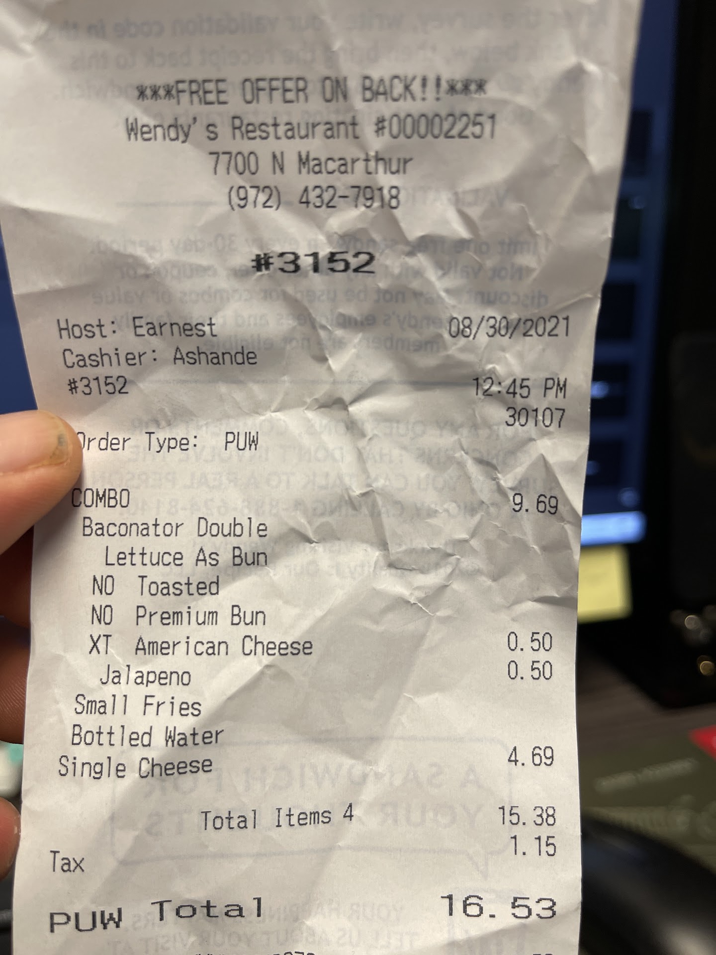 It’s fine. At this point, I was as done with this encounter as the guy taking my order was. And I could tell he was BIG time done. I paid and waited for my receipt so I could at least see what I did order and he took it quickly and walked away.