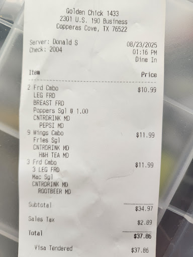 Read moreI was so excited to get a golden chick in Cove. I like many ignored the negative reviews and thought let me give them a try. I have never been so upset with a fast food experience ever.