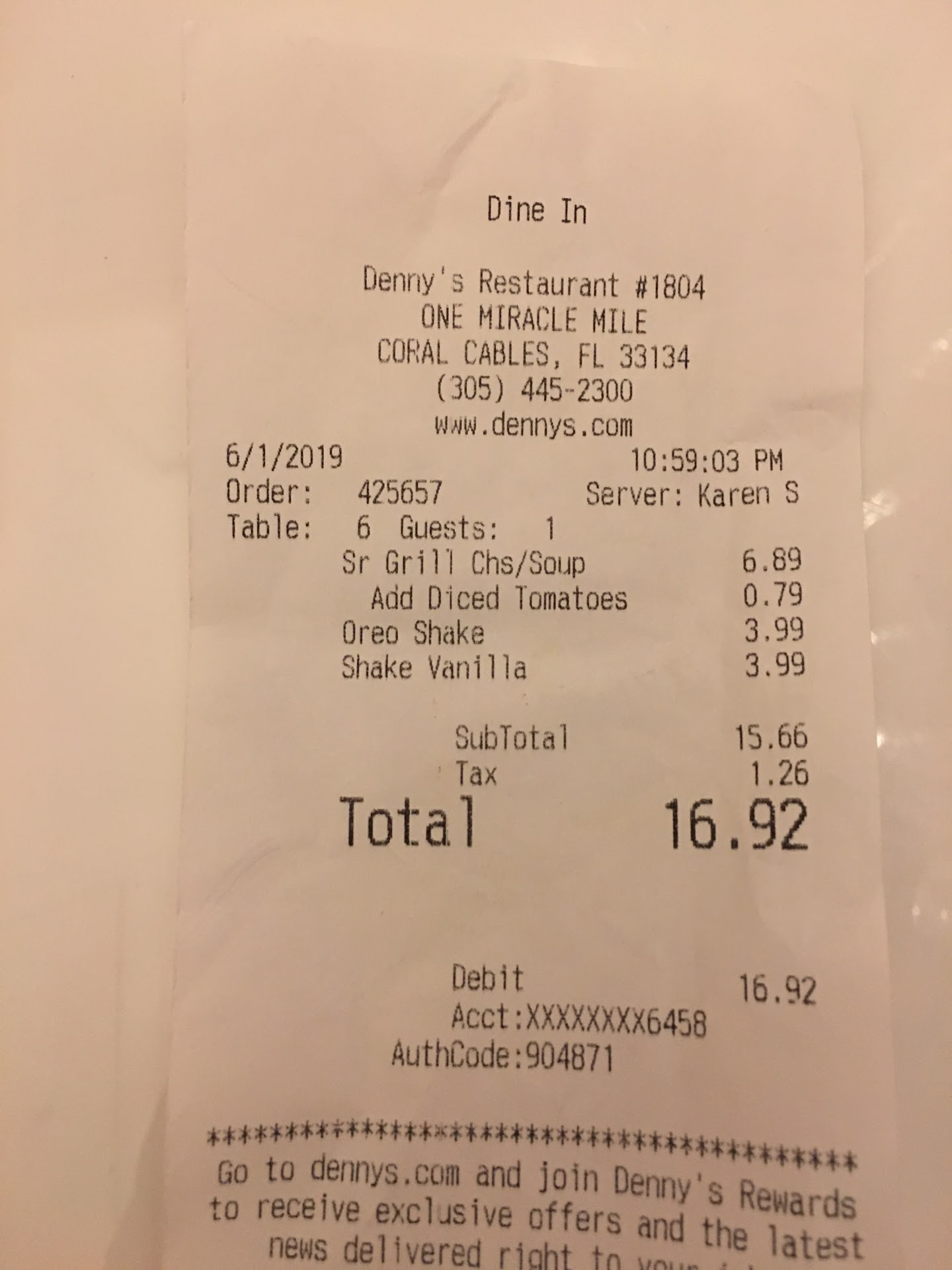 As I have traveled throughout US . Dennys is always the place most Americans can count on . Some better than others . Itâs a decent breakfast many hrs a day , comfort food anytime American food . The Menu is consistently mostly the same . But who cooks it & who services you itâs what makes the difference. Went to this Dennys I used to go when younger at times when visiting Miami Florida. Because the one we go to is remodeling. I say this Dennys Service is at top of list for being the worst at service, the worst at accountability, the worst at not refilling your coffee cup . Getting overcharged. And charging incorrectly And forget about bringing it to their attention and letting Dennys corporate know . You get a person from the restaurant that can barely speak English calling herself a general manager . Which tells you the best she can do for you is for you to go back that restaurant so she can give you a free meal . And then she basically tells you that this location is a franchise and they have their own rules . She also makes a point to tell you Most Dennys are franchises nowadays and they are ranned by Franchise owners so they now operate differently. Which tells me the old American ways of Dennys are gone & if I want better I need to scratch them off my list and share w/ the world my experience. Most of the consumers that eat at Dennys have a certain expectation of decent reliable service with a menu and a good recipe that you can always count on . This attitude of no accountability is not what this Country was build on . Sadly we have to now consider to change old habits and have lower expectations if we go to places like this . Or find better choices . My suggestion is : Donât try this Dennys which is probably at the top of the worst Dennys in America . Ironically they are located on Miracle street . And it might just take a Miracle to make this place stay afloat. Youâll check it once and probably never return. The food is not the problem. The cook is ok . Itâs the service and management that...