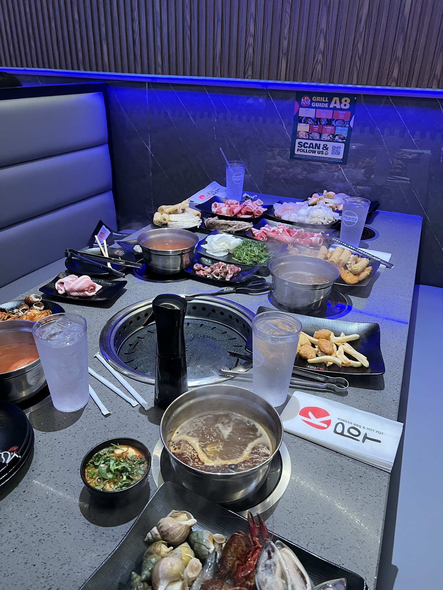We all went on Friday night, 45 minute wait( no problem) was notified by phone table was ready and then was told there was no record ⌠got that straighten out and was seatedâŚ. Asked to move to another table as the AC was blowing so hard it was blowing the menuâs off the table⌠needless to say we had to move two more time⌠finally had waiter come to table and take order for your meats ,as we had both b b q and kpot⌠only aloud to order 5 items for the table at one time then can reorder⌠we all went to the buffet bar and when we returned meats were placed on the table and were in wrong places, and you really didnât know what was what as far as the beef and pork wentâŚthen you have to cook the beef, pork, chicken and seafood all in same grill âŚ. servings were like sample size and wasnât very good no seasoning âŚBest part still to come, you had to ask for silverware and we were told that only had butter knifeâs and that the scissor (1) on the table was used to cut the steak and pork ( have never in my life ever seen a scissor used to cut meat at a table )as none of us liked the food and didnât reorder the waiter stated that he wasnât going to charge us the â waste of food chargeâ what the hell, we paid for our food. Our drinks were forgotten and it took about 35 minutes to get them. They were brought by the highlight of the evening a cart robot that brought them to your tableâŚwe had ordered an order of shrimp and placed in grill , but weâre not cooking they had turned grill offâŚ. Deserts were nothing to get excited about ,But they did have ice cream cups none of us had desert..Can I just tell you it was an interesting evening to say the leastâŚ. Would we go back not a chanceâŚ. If you do decide to go and check it out for yourself, the decor is cool, the bar is awesome but it stops there !!! make sure you bring a sweater or jacket its so coldâŚ.. also salad is on shelfâs ( many different choices)you pick what you want but the size is that of a head of lettuce, kept nice and cold as you can see the cold vapor coming from the areaâŚdressings and sauces across the room and was not kept wiped downâŚagain not my cup of tea.. we will not be...