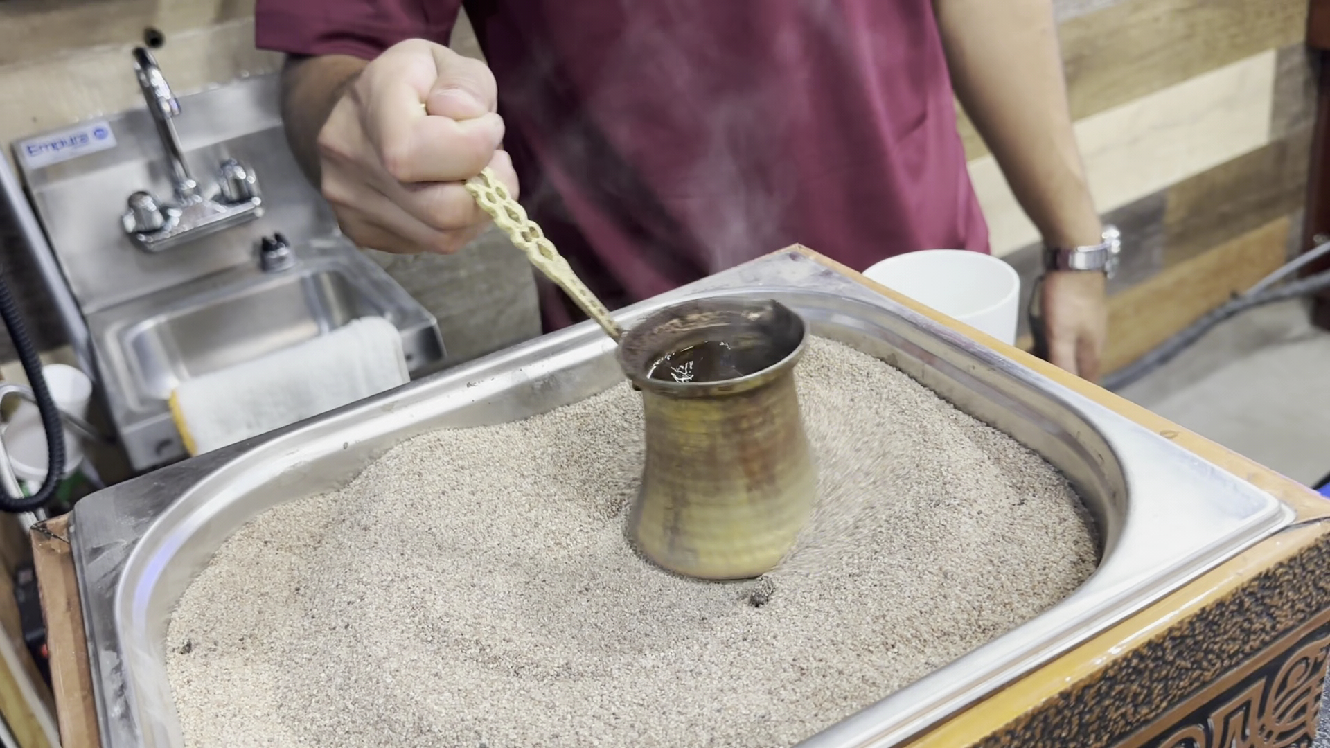 Desserts: Omo Ali: A less sweet bread pudding with sour cream, honey, and pistachios. Arabic Coffee: Uniquely prepared in a pan with hot sand.