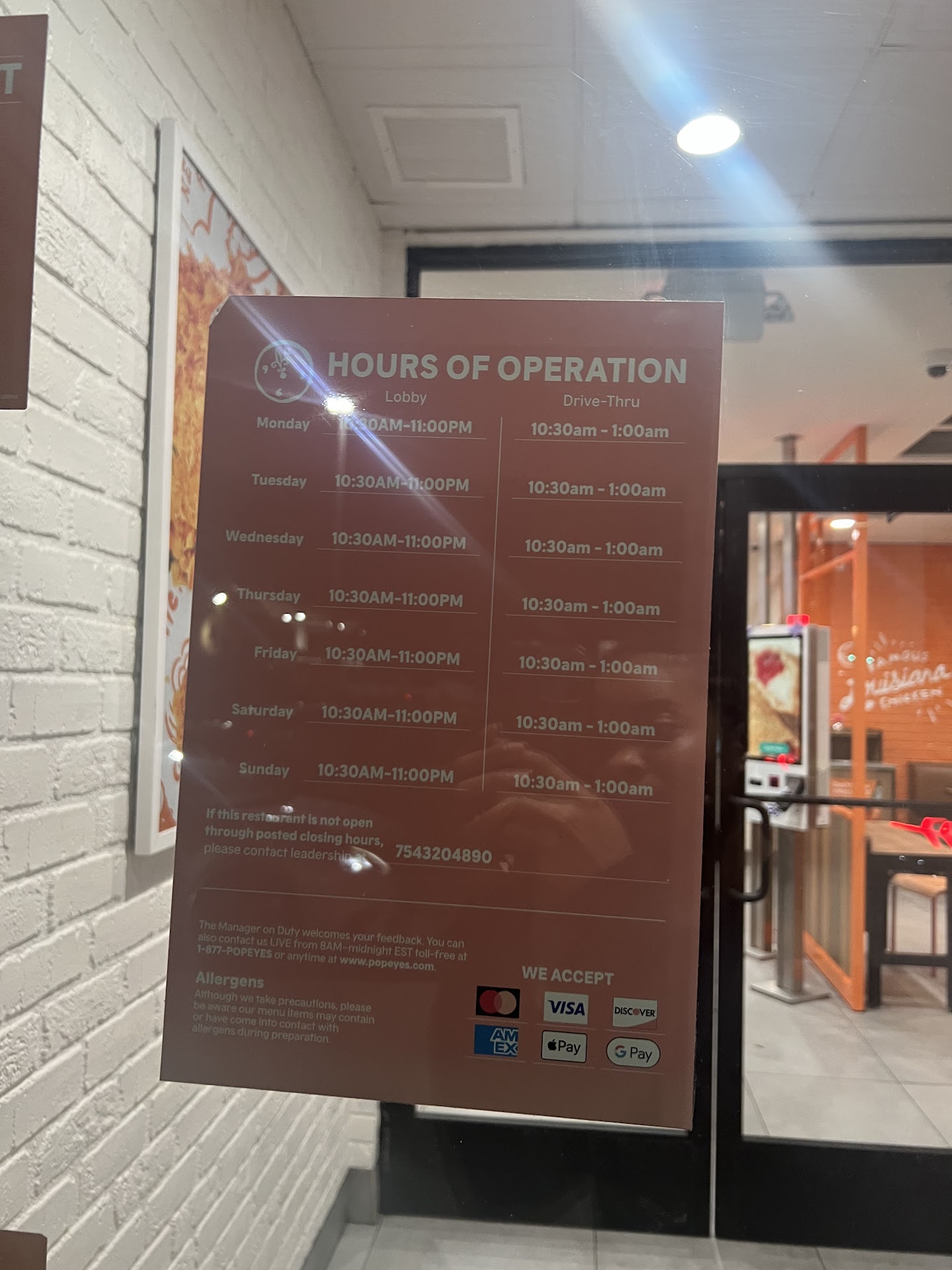 Read moreToday was my first time trying Popeyes since everyone has been recommending me it. I must say it was HORRIBLE! I had gone there at 8:00PM on 09/08/2024. They seemed to be staffed but very unorganized. I ordered the Spicy Chicken Sandwich Combo and I waited for 20 minutes. I had went to the restroom and it was entirely filthy, it smelled horrible in there and the smell was suffocating and the cleanliness was very low. I had come back and my order still was not ready. I thought, âMaybe theyâre making fresh batch of chickenâ I was wrong. After I got my order, I got in my car and took a bite of my chicken sandwich and it was cold. It seemed like it had been sitting there the whole day. The buns werenât toasted at all, the chicken was very tough and chewy. When I decided to try the fries next it was also cold and seemed like it had been sitting under the heating lamp all day. It was a waste of $12 for the quality of food that had been served. Honestly, I wouldnât recommend this place. For my first time trying Popeyes, it was horrible. Maybe, Iâll consider trying somewhere...