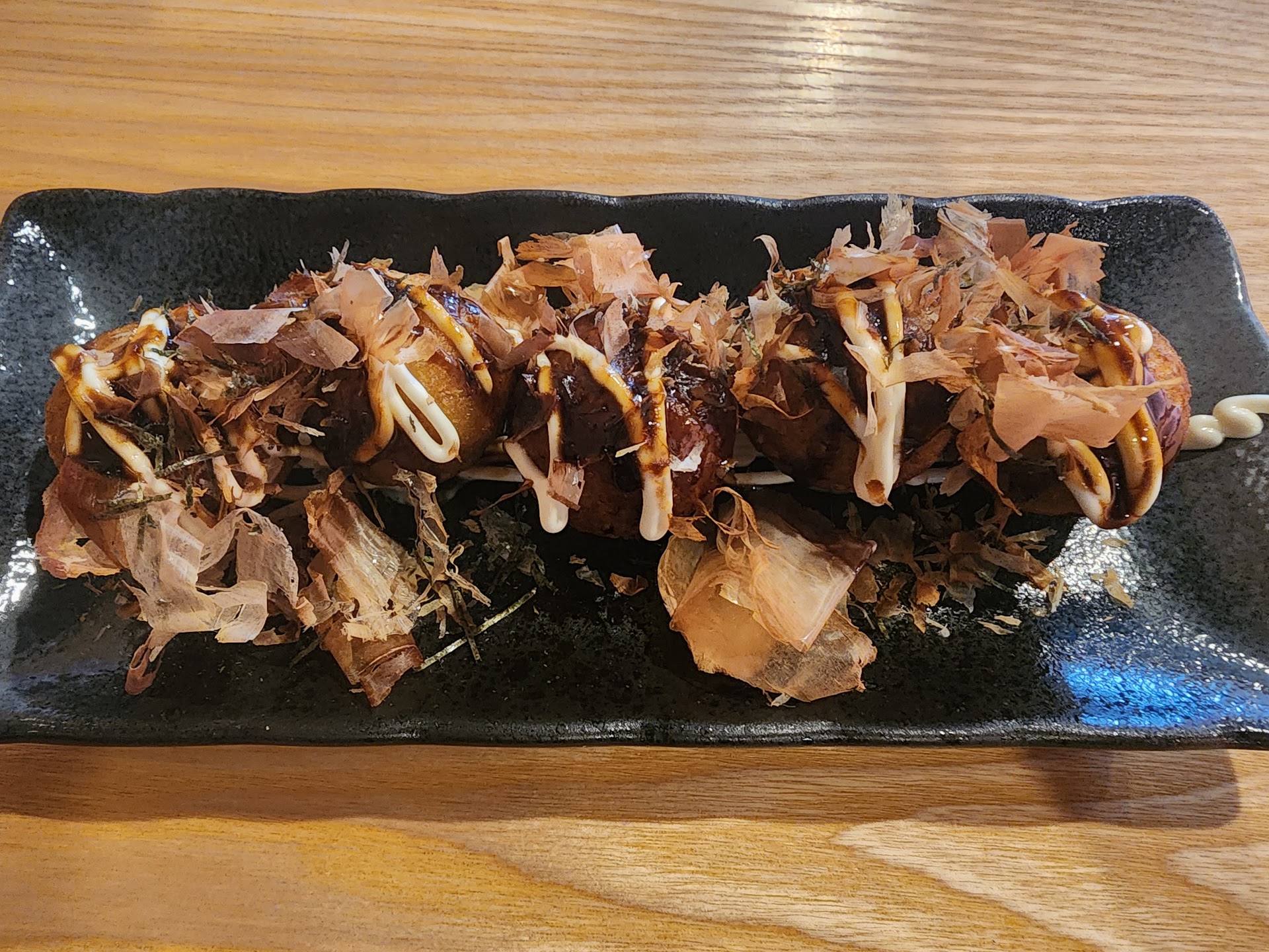 We started by ordering two appetizers. The Takoyaki and Bao Buns. The Takoyaki was good. It came covered with Bonito flakes, maybe a bit too much but whatever. The filling inside was rich and flavorful, and there were noticeable pieces of octopus. The Bao Bun were just alright. They came absolutely loaded with pork belly. Good if you like pork belly, but honestly, we had to remove some to be able to actually hold and eat the buns. The flavor of the pork belly was warm (nutmeg/cinnamon-y) and sweet. The pork itself was tender. However, it desperately needed something acidic. Pineapple would have been a great choice. The appetizers are also when I started to get suspicious that the food, at least partially, was not made in house because the food was coming out at alarming speeds.. our orders and for other tables that had walked in. One guy even commented out loud, "wow, that was fast!"