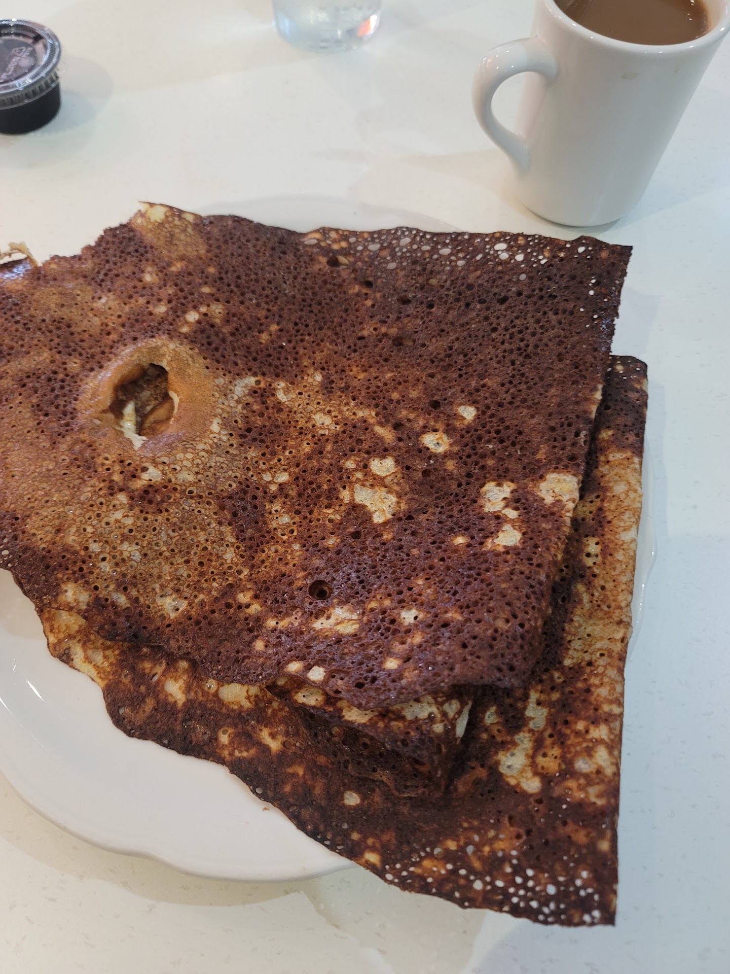 When she delivered our coffees, we placed our orders. I chose the Western Omelette (ham, onions, green and sweet red peppers, and cheese) which is served with a side of salsa. Hubby ordered the Ham and Cheese Omelette (diced ham and cheese). Both omelettes came with a side of 3 pancakes. Our food came out, delivered by an assistant manager, and mine didn't have the salsa on the side, so I asked for it. She seemed to sigh and told me she'd go get it for me. After she brought out the salsa, we started to eat. Hubby then noticed that his omelette had mushrooms in it. Our server came by to check on us, and he sent his omelette back stating he only wanted ham and cheese. He did eventually get the correct order. My omelette almost no cheese in it. I had order American cheese, and saw a spot of it halfway through the omelette (the size of a pencil eraser). The omelette had good enough flavor, but it would have been much better with the cheese. The pancakes were good, so that's a plus!