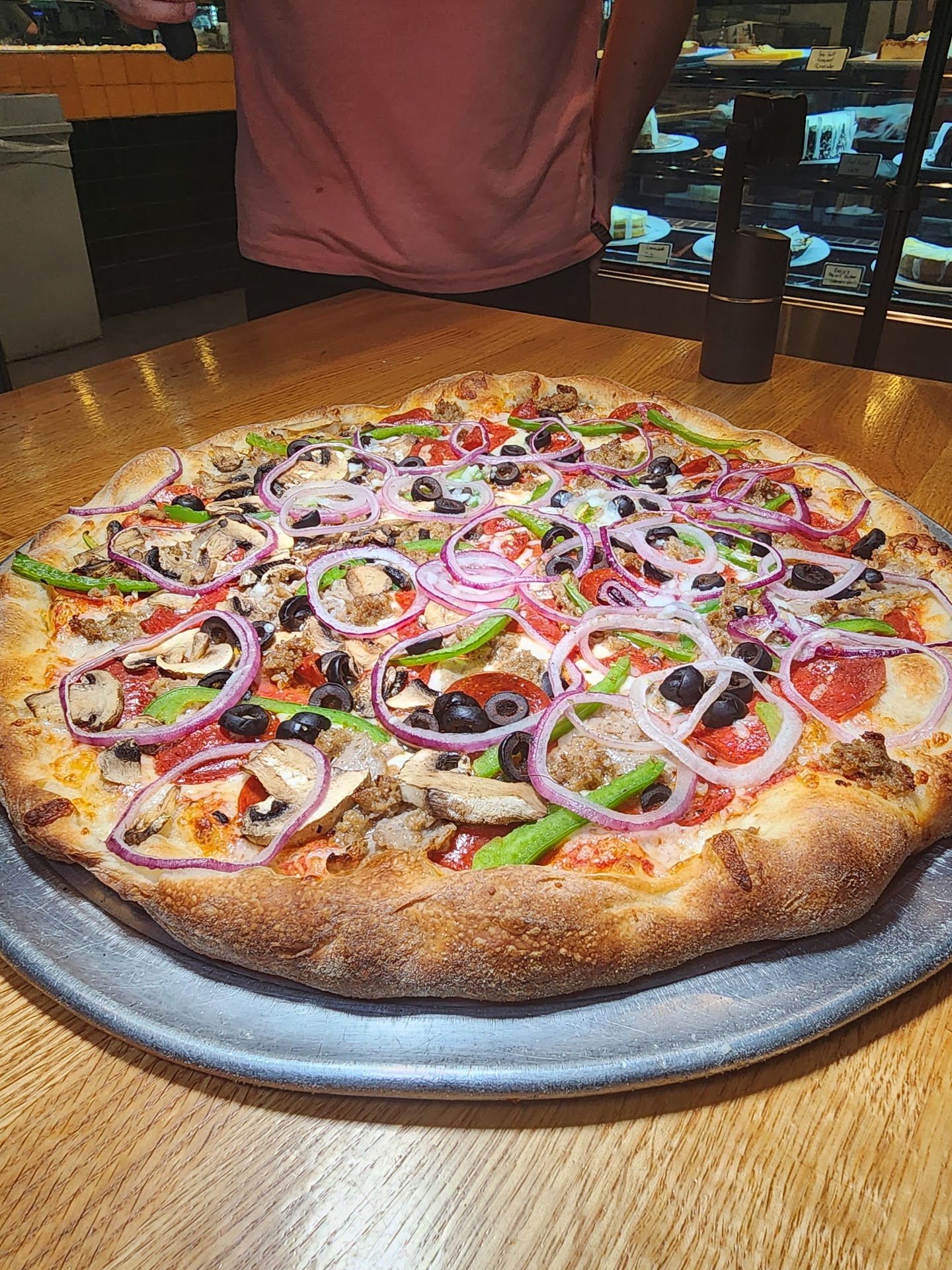First time here. Walked in and the delicious aroma of pizza baking hit my nose and i was hooked. Lol š Small place, very few tables inside and out. If you are a group of more than 6, you will not have comfortable seating. Service was good catering to our every need. Serve yourself soda dispensers with free refills. My son loves free refills. The menu has lots of choices of pizzas, entrees, subs and salads. There are also lots of toppings to choose from and a few different types of the pizza itself. Ordered specialty pizza with chicken, mushrooms and pesto toppings. It was absolutely delish. Served with marinara sauce on the side. Dunno why sauce was not on the pizza in baking, but all their specialty pizzas are prepared that way. Never had a white pizza before, but it was so good that sauce was not needed. Of course, you can pour the sauce on top yourself which gets messy, or dip your slice with each bite which is too much work for me. Also had the garbage stromboli which is like a calzone with several meats. Very cheesy, baked to a golden brown and also delish. Ordered a chefs salad which was big enough for 3 of us to share. Plenty of cold cuts, cukes and shredded american and mozarella cheese. It was really good. You can also order pizza by the slice. My family had a great experience. My only complaint was that it was overpriced, especially for the specialty pizzas. But it was so good that i was willing to overlook that. Will return again. They also have free...