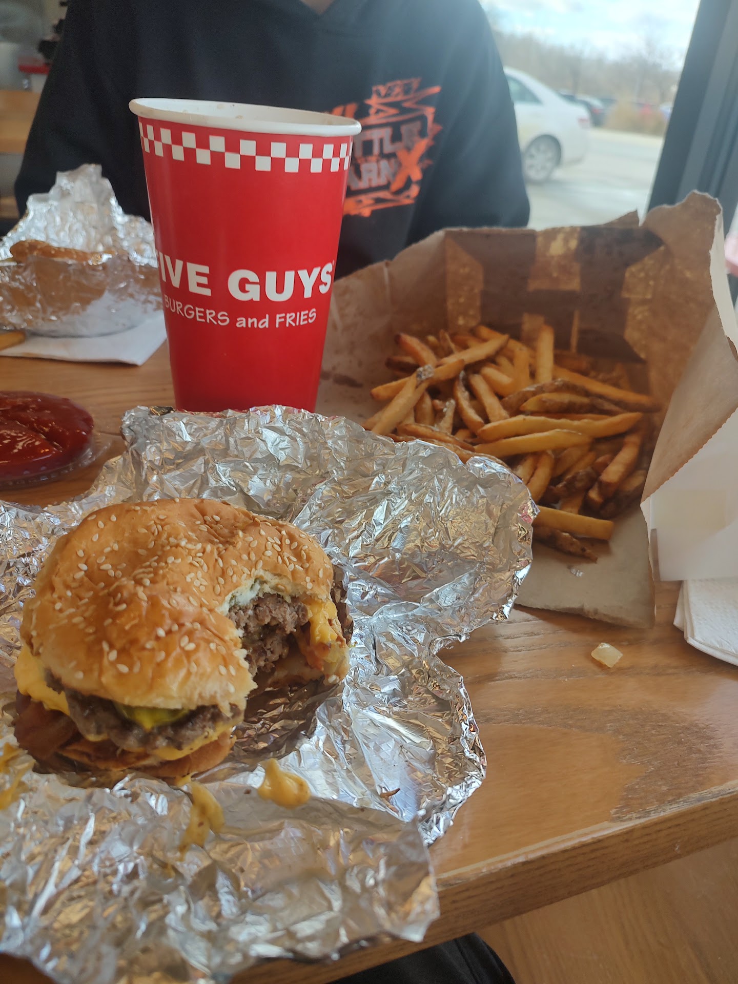 We ordered a cheeseburger loaded with all the sauces, and it really hit the spotâeven when itâs -15 degrees outside. Next time, weâd probably skip the cheese since it is a bit oily and keep the mustard for that tangy kickâit added just the right flavor boost. The best part about Five Guys is the endless customization, so you can make your burger exactly how you like it.