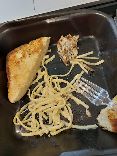 The chicken as you can see has small specks of BLACK, do they just not clean their grills? There was mostly oil at the bottom of the to go container and barely any Alfredo sauce???