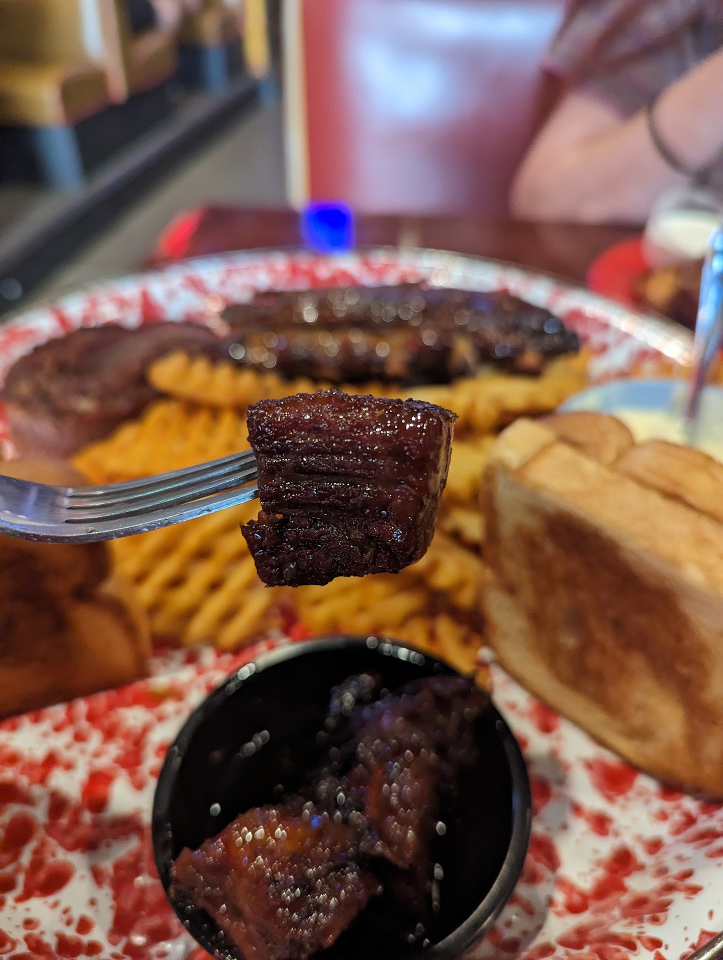 I enjoyed the half slab of ribs and added the sweet BBQ sauce. Ribs were tender and fell off the bone which I love. Apparently, they are heavily smoked; my digestive system kept reminding me of that throughout the evening and into the next day. That's on me; my digestive system is finicky.