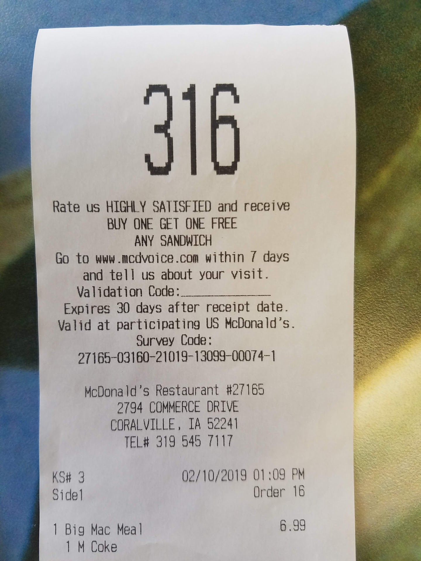 We make this our regular stop traveling across the state and love it. This past time I texted this message to all of my soldiers in the middle of a snow storm right before we stopped at McDonald's and the God of miracles happened to show up. Guess what order # we got when we walked in the door? Truly truly I say this to you. Look at the receipt pictured! To God be all the Glory!
