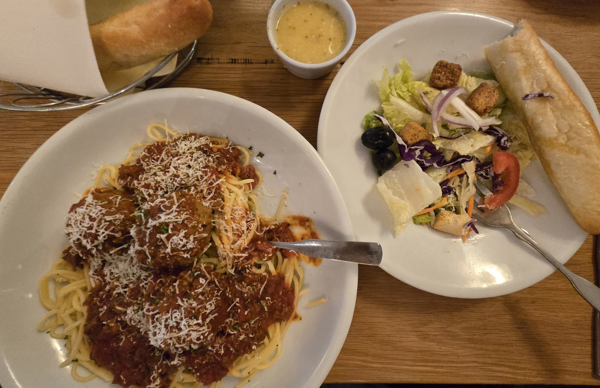 Spaghetti with Meat Sauce: This classic dish is always a comfort-food favorite. The spaghetti was cooked al dente, giving it the right balance of firmness. However, it felt somewhat under-dressed in its meat sauce. There was a noticeable lack of the hearty and rich flavor that usually defines this dish. The sauce-to-pasta ratio could have been better, and it would indeed be beneficial for Olive Garden to consider providing an option to add extra meat sauce when placing orders. That small adjustment could significantly elevate the dish for those who prefer a more generous sauce serving.