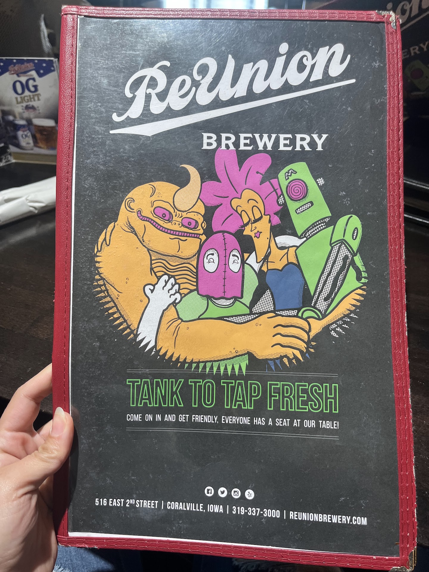 Beer: Best lagers in the Iowa city area. Fantastic and balanced Munch lager, superb German-style lager, good Marzen. For the hoppy ales, Reunion is excellent for their sessionable offerings. The big "Tank-puncher" leaves me wanting more aroma and less raw IBU's.